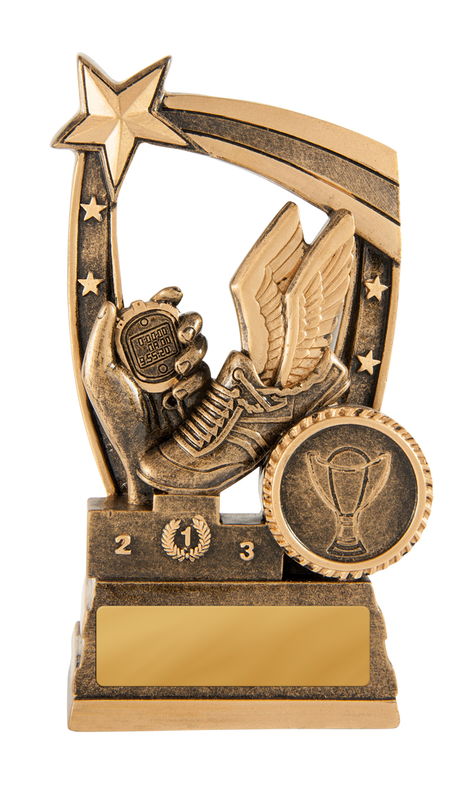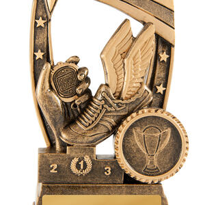 Celebrate speed and achievement with this resin trophy, designed for standout athletics awards. Featuring a winged running shoe, stopwatch, and medal set against a border of victorious figures and stars, it recognises excellence in track and field.