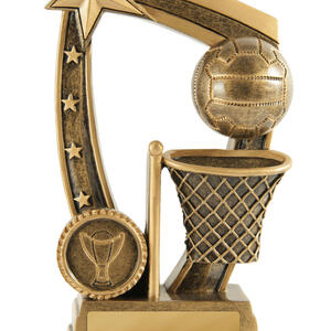 This netball trophy features a striking 3D design with a netball and hoop, accentuated by star motifs and a classic trophy emblem. Crafted from resin with a rich metallic gold and bronze finish, it offers both visual impact and durability.