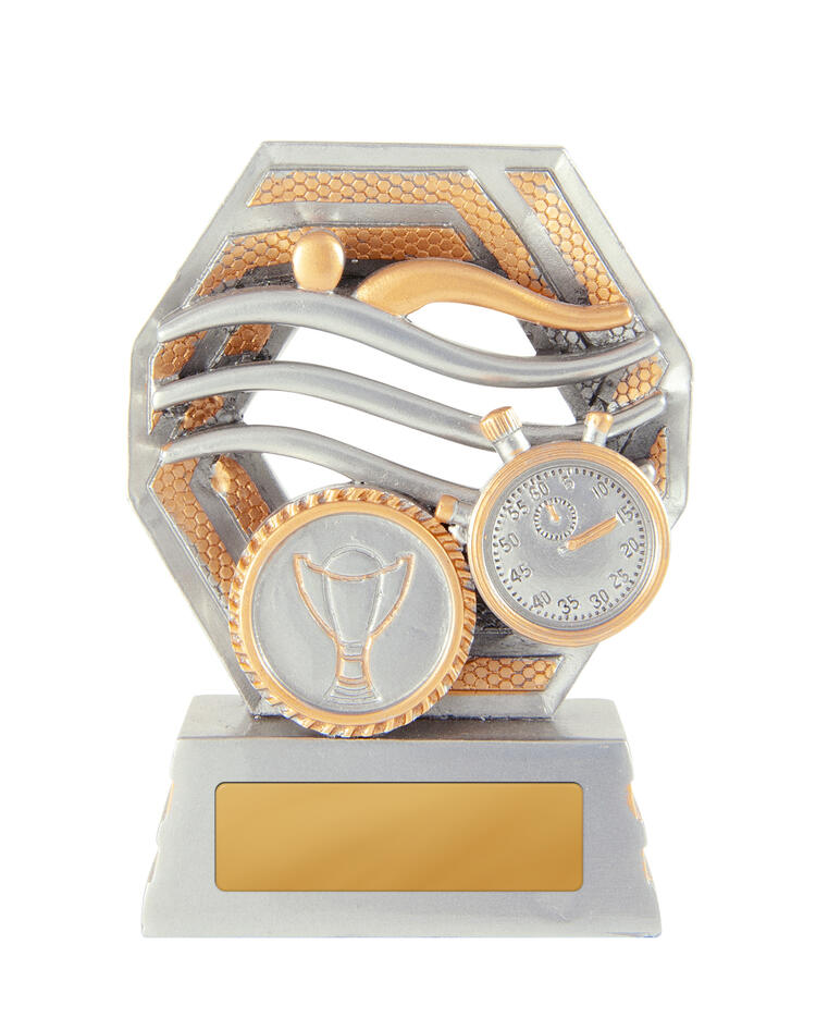 Celebrate swimming excellence with this dynamic resin trophy featuring a swimmer in motion and a detailed stopwatch. Finished in antique silver and gold tones, its a perfect award for swimming carnivals, time trials, and meets.