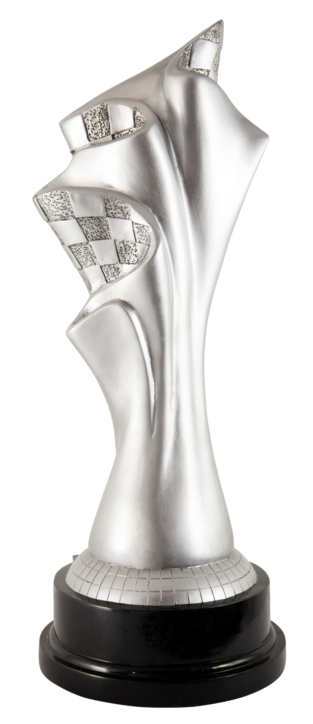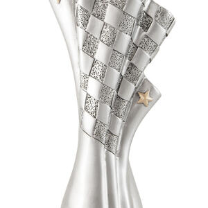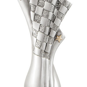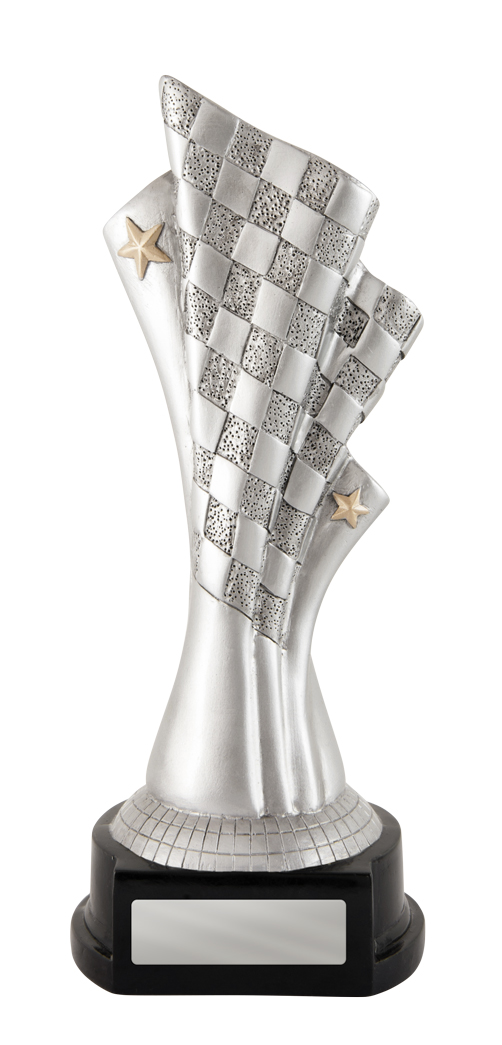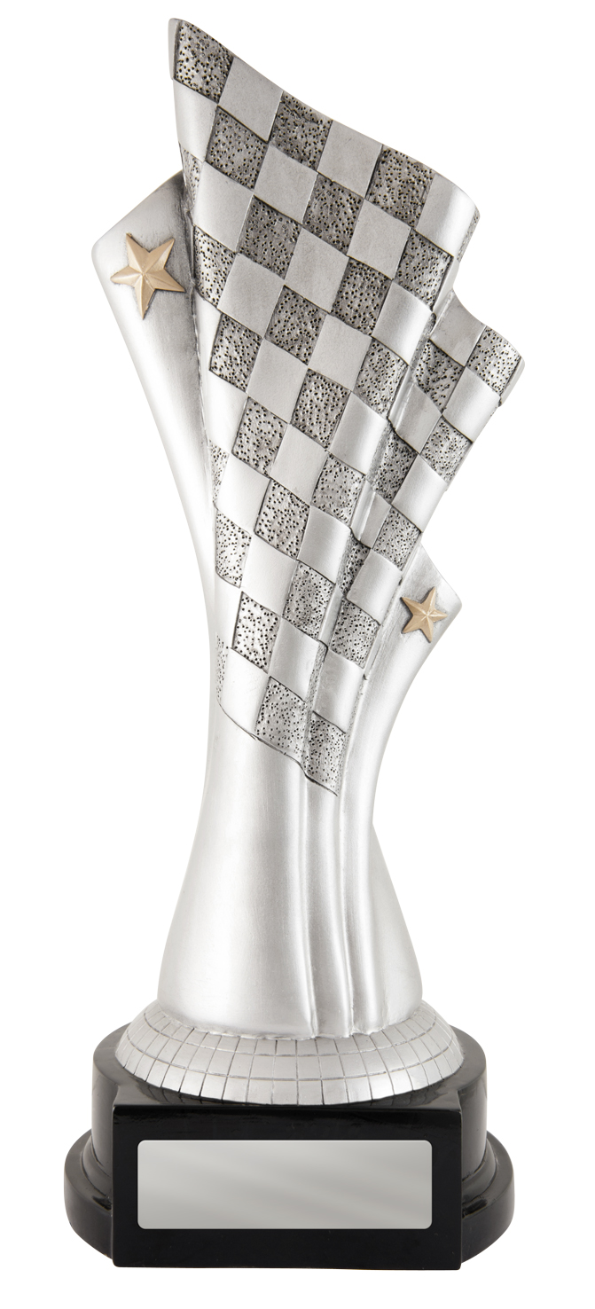 Inspired by the thrill of the track, this motor sports trophy showcases a bold checkered flag design with gleaming star accents. Crafted from resin, its elegant form is mounted on a black base. A silver plaque allows for personalisation, making it an outstanding choice for racing trophies and motorsport awards.