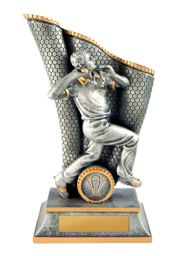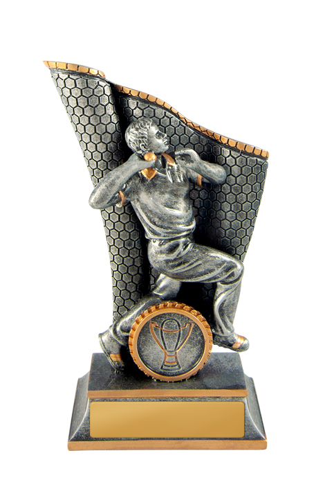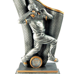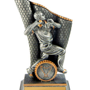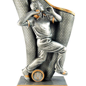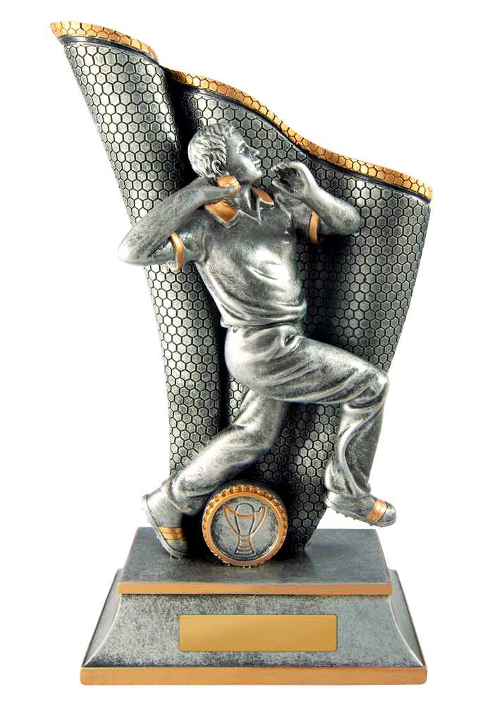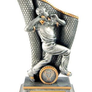 Celebrate cricketing achievement with this crafted trophy, featuring a dynamic bowler figure set against a curved, hexagonal patterned backdrop. It offers a sturdy column base and a trophy emblem for a polished finish. Customisable with personal details, it is a trusted choice among cricket trophies.