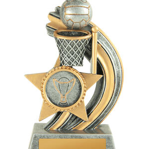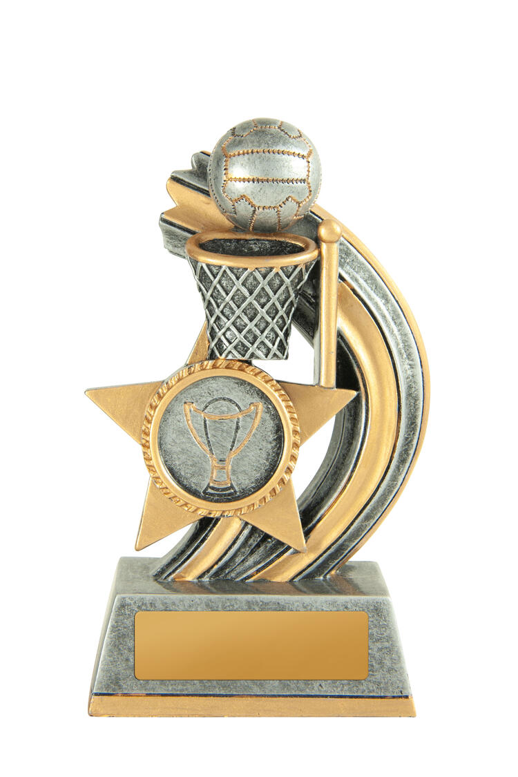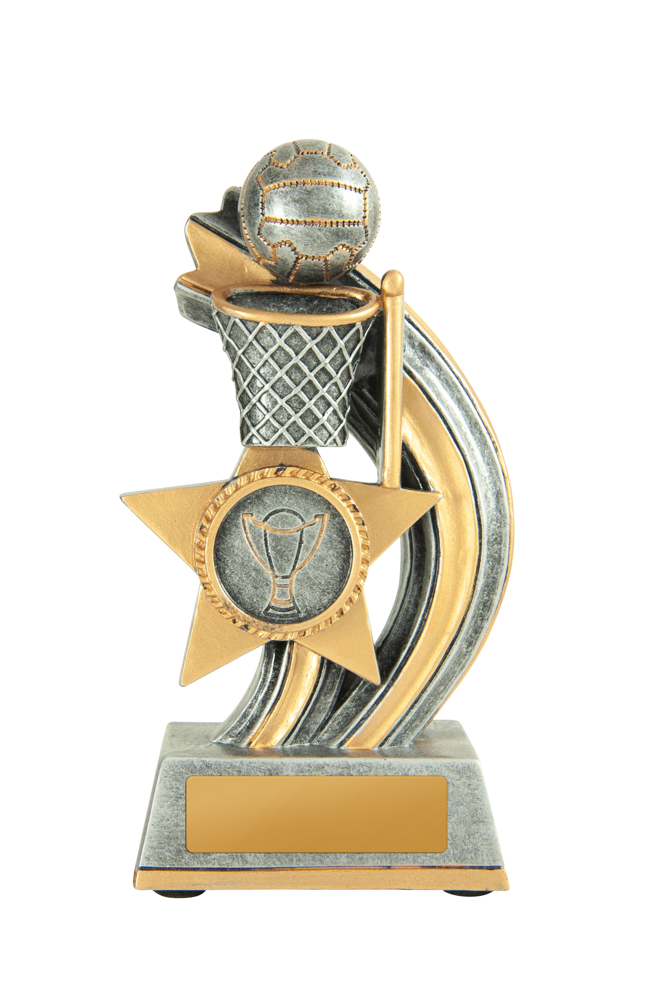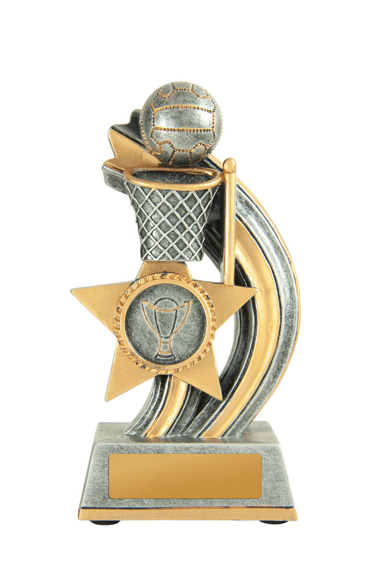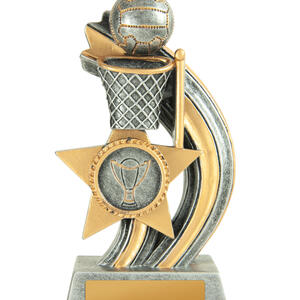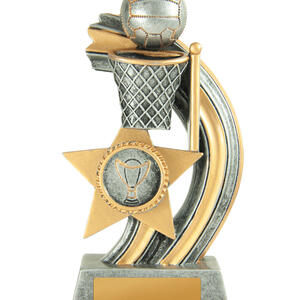 This contemporary trophy stands out in the world of netball trophies with its dynamic curved base and striking 3D star design. The combination of antique silver and gold tones, along with a detailed netball and net motif, creates an elegant tribute to achievement.