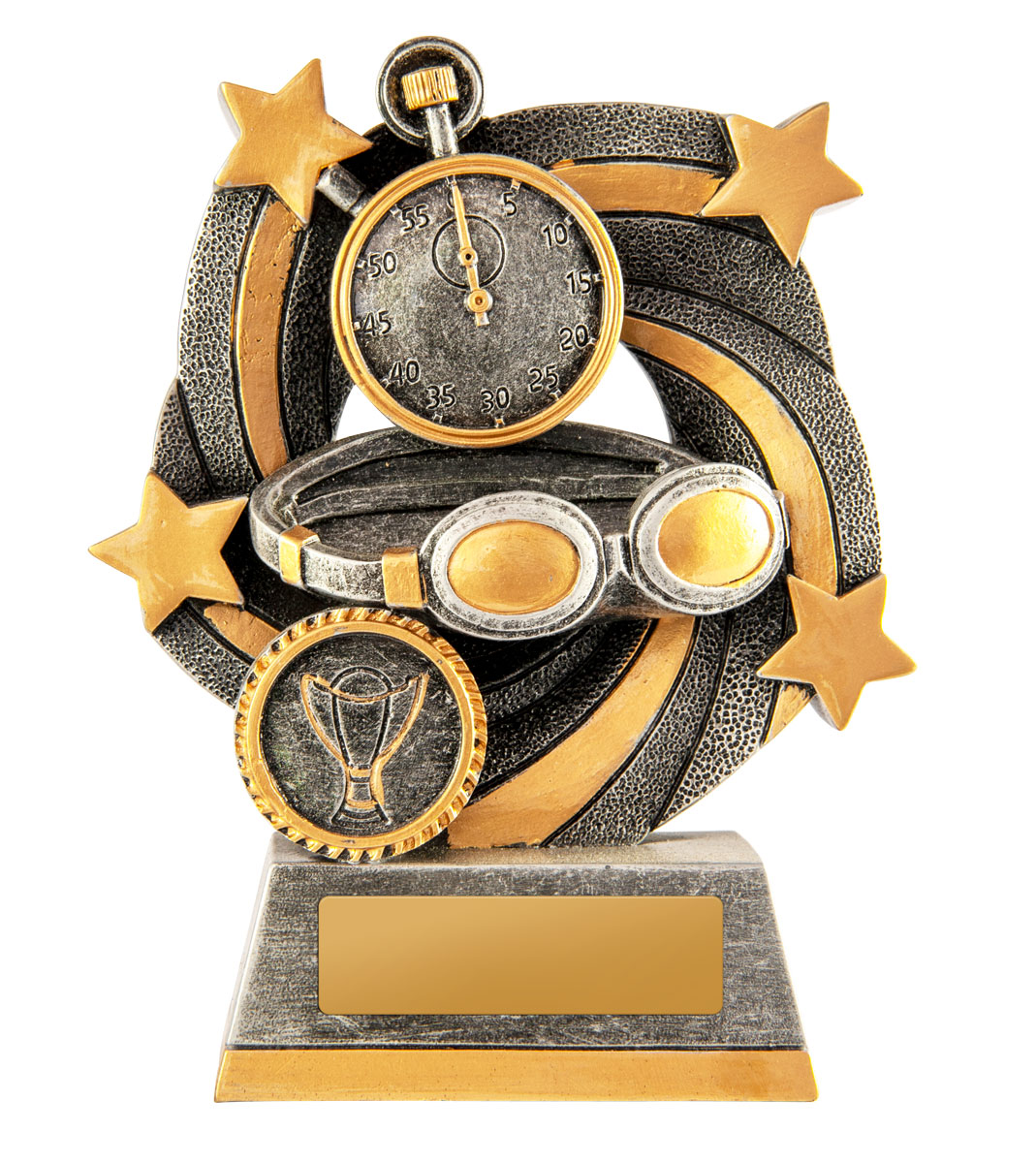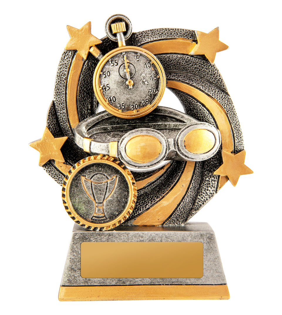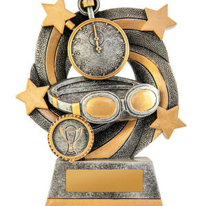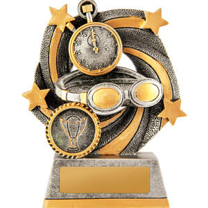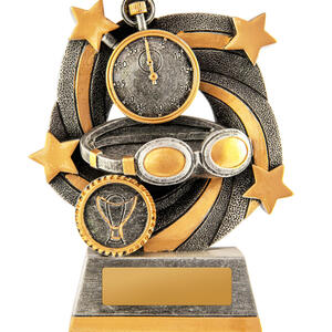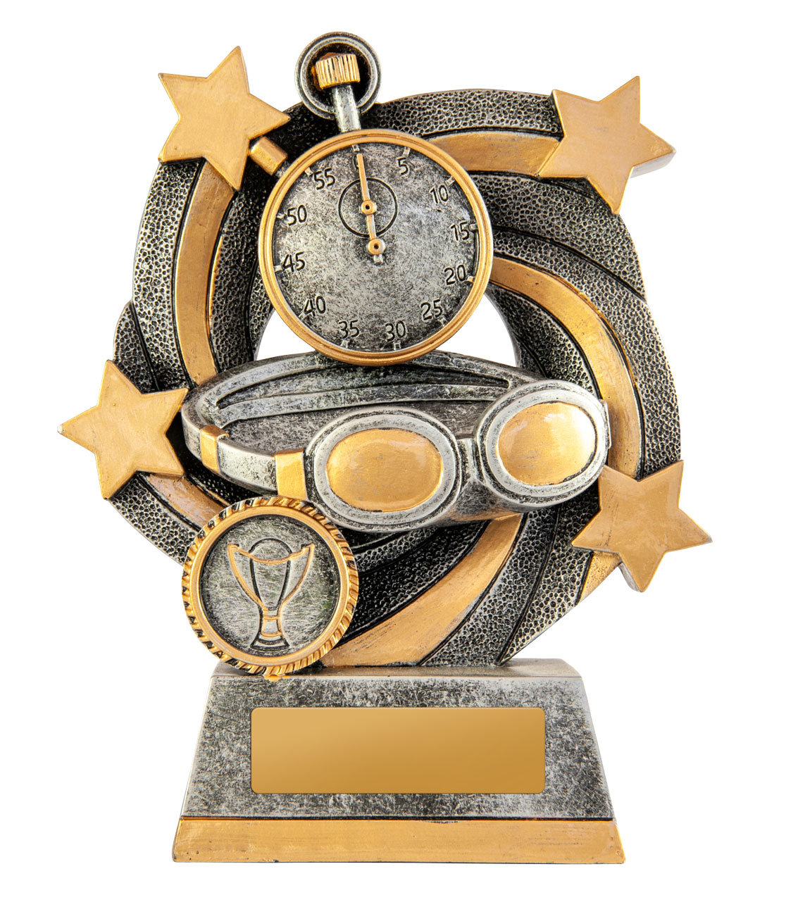 Showcasing a distinctive shield and oval design, this swimming trophy features a striking combination of a stopwatch, goggles, and cascading stars, crafted in a refined bronze and gold finish. The layered elements and pool imagery capture the dynamic spirit of swimming and achievement.