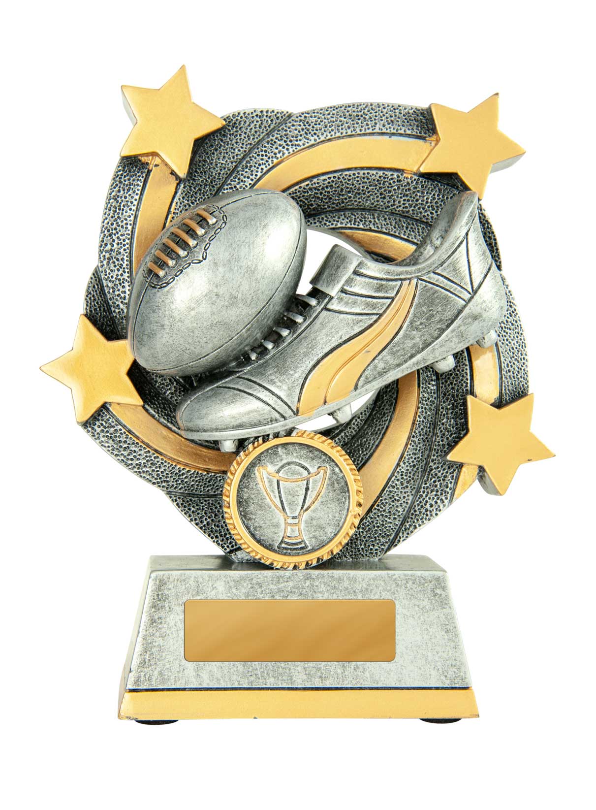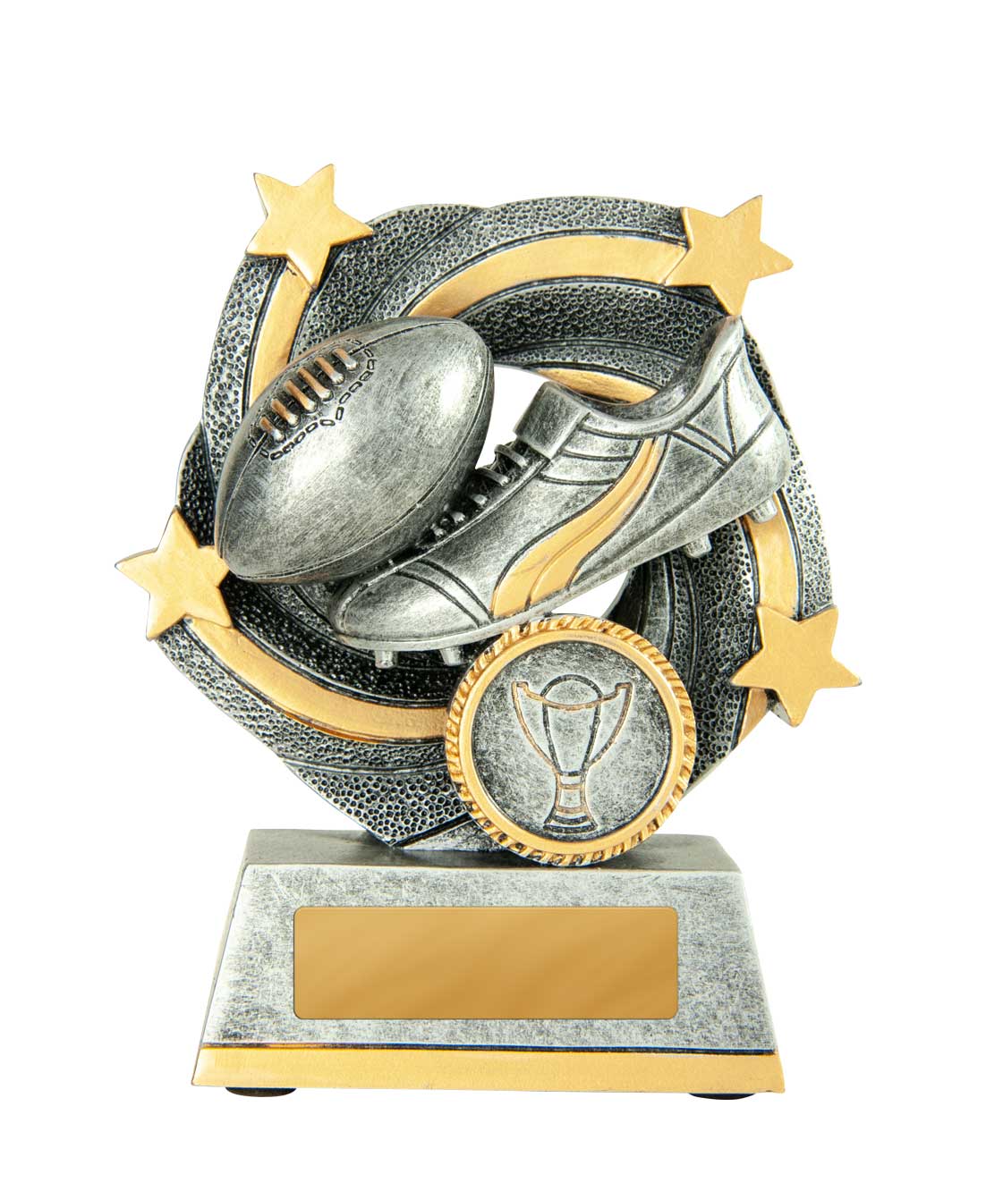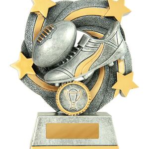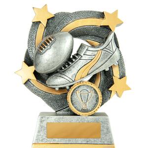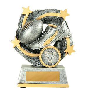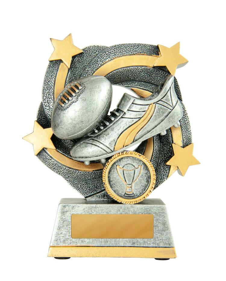 This afl trophy offers a striking blend of tradition and modern design, crafted in antique silver with refined gold highlights. A stylised football and boot motif, complemented by star and wreath accents, creates a memorable tribute to achievement on the field.