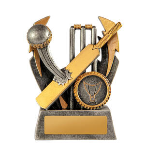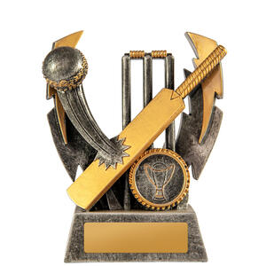 Celebrate outstanding cricket achievement with this elegant cricket trophy, crafted in gold and silver finishes. The design features a striking combination of cricket bat, ball, and stumps set against a trophy emblem, creating a memorable and exclusive recognition piece.