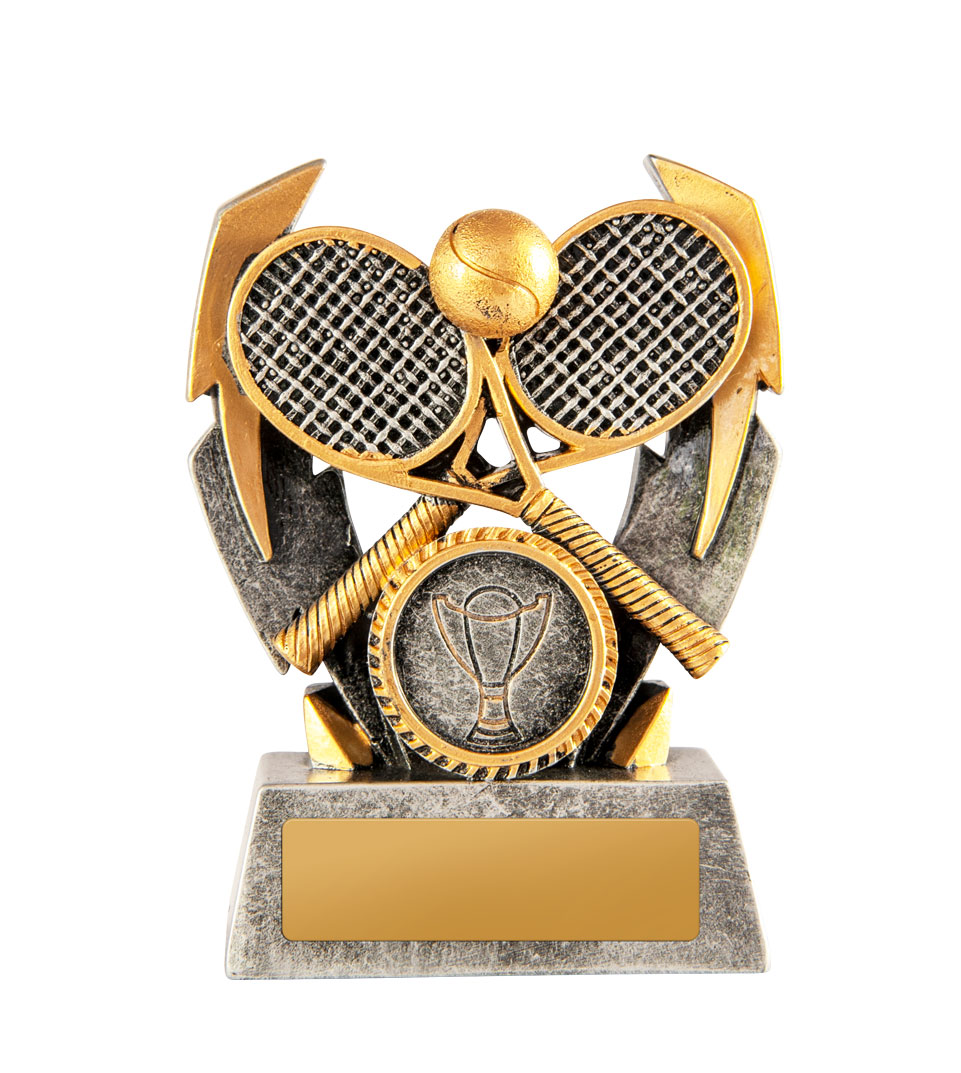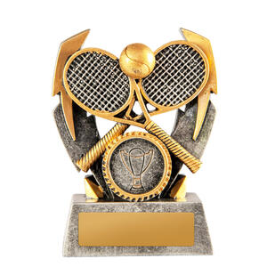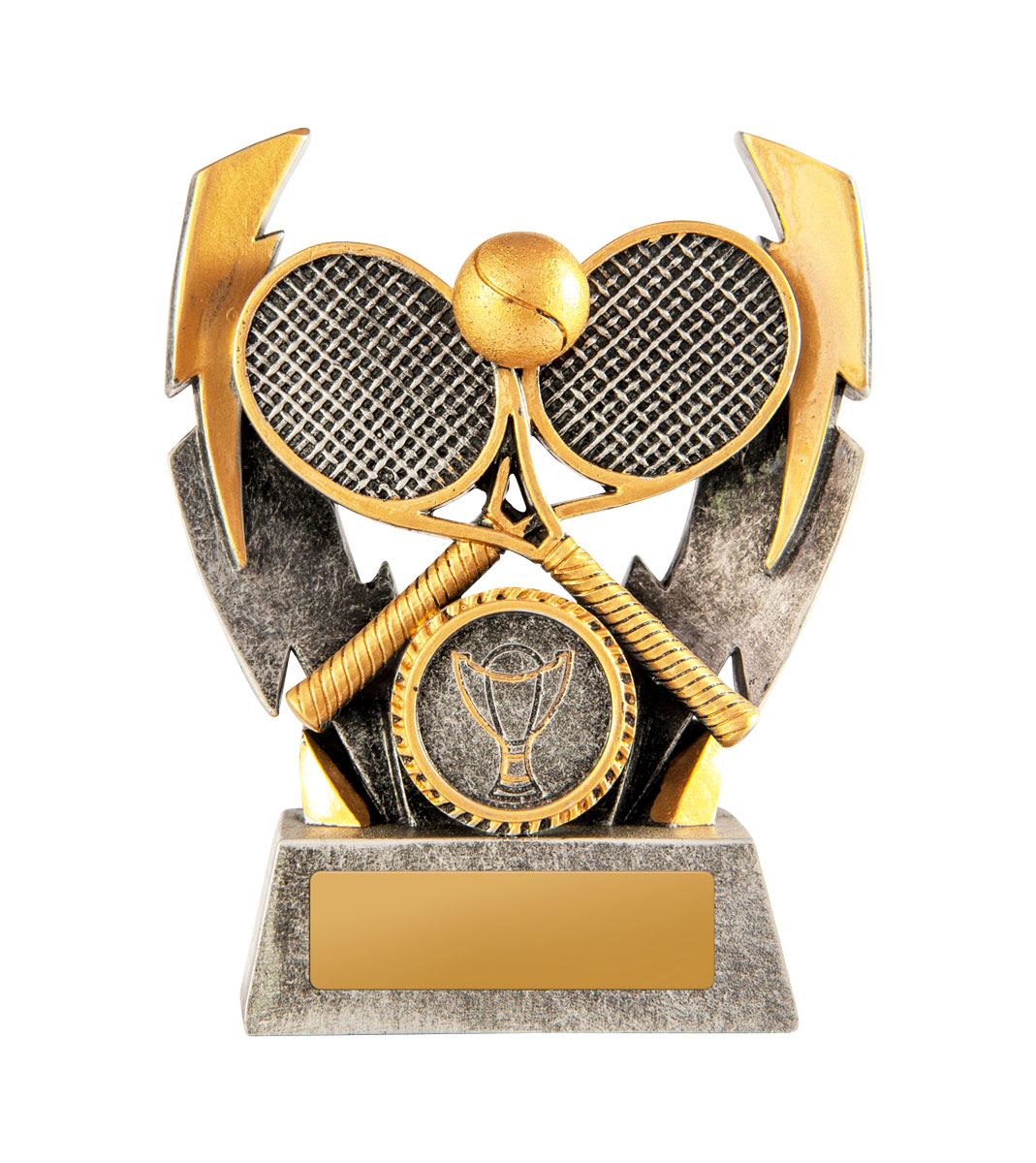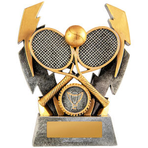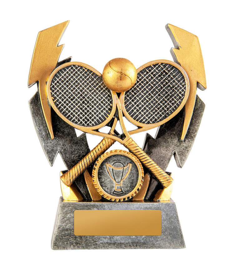 Crafted to recognise tennis achievement, this trophy from the Double Lightning Strike Series features two crossed rackets and a tennis ball, set on a sleek base. It offers a refined choice for tennis trophies. Resin construction and the option for personalised engraving create a memorable and exclusive recognition piece.