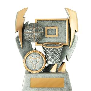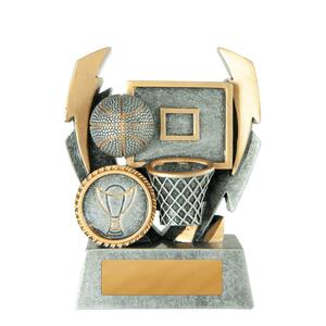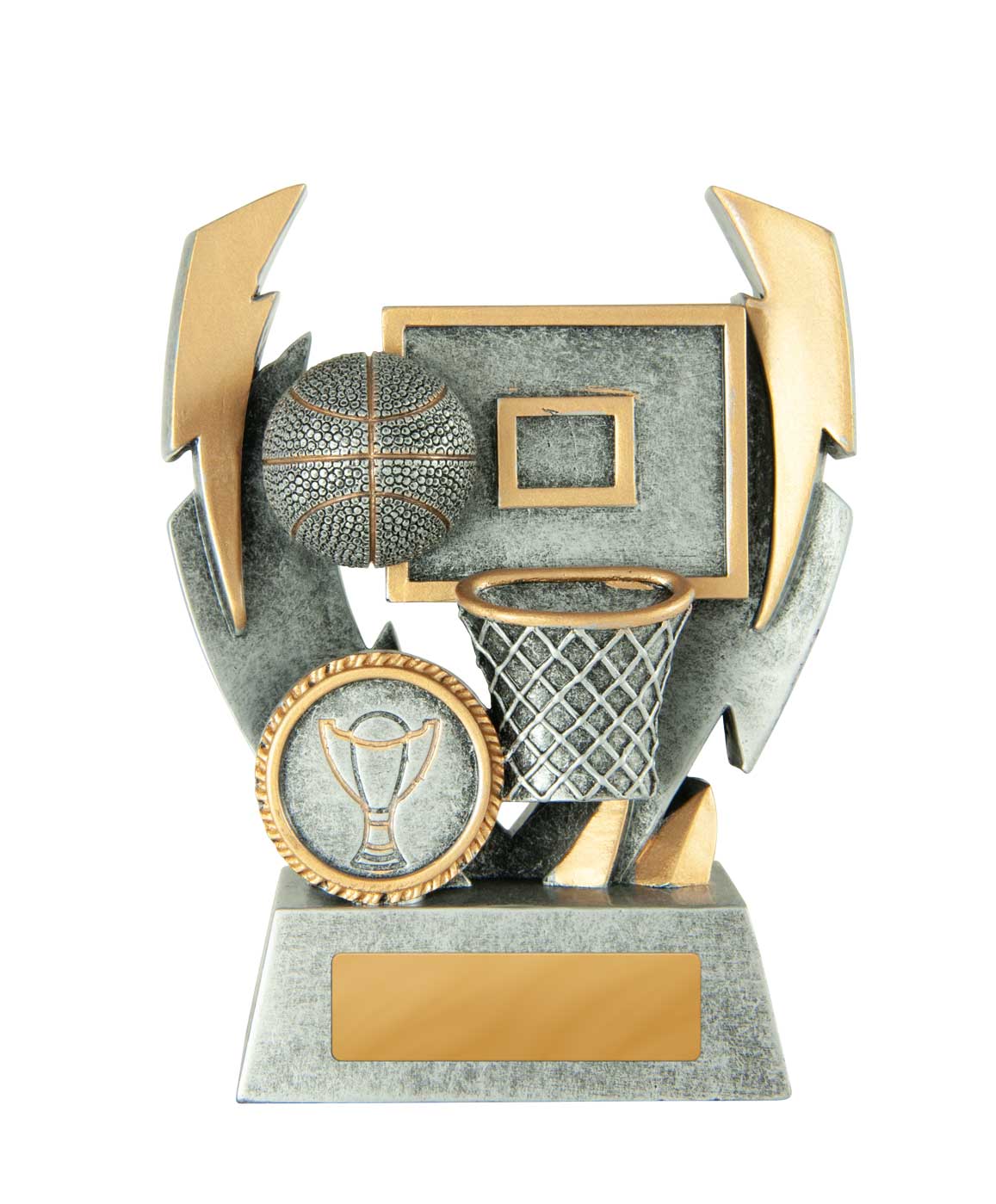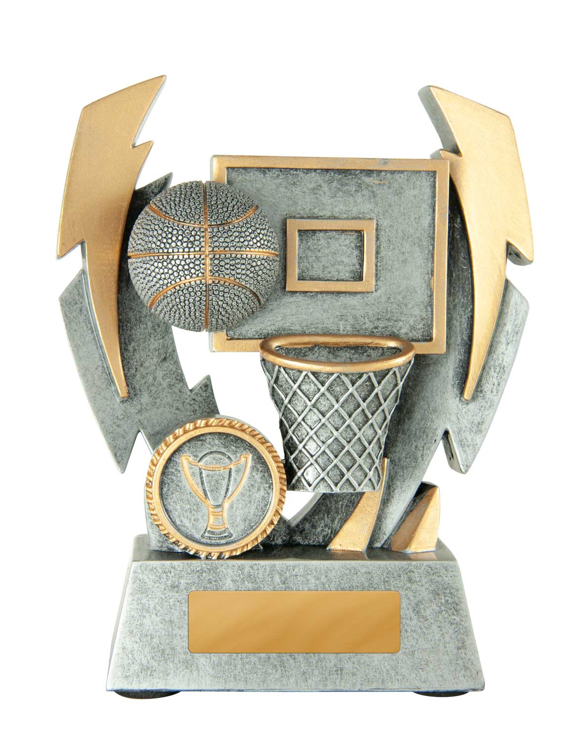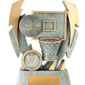 Crafted with a dynamic double lightning strike design, this basketball trophy brings a sense of energy to basketball awards presentations. Finished in antique silver and gold, it features a detailed basketball, hoop, and backboard scene, all set in durable resin.