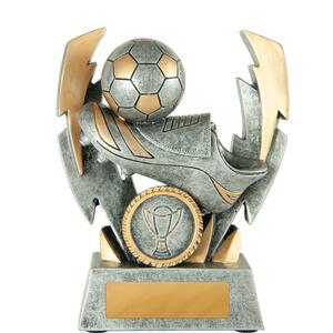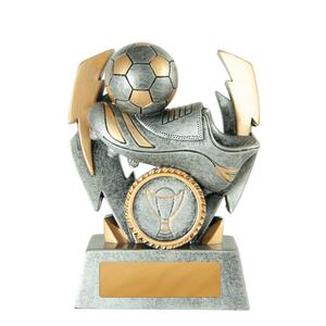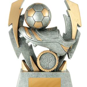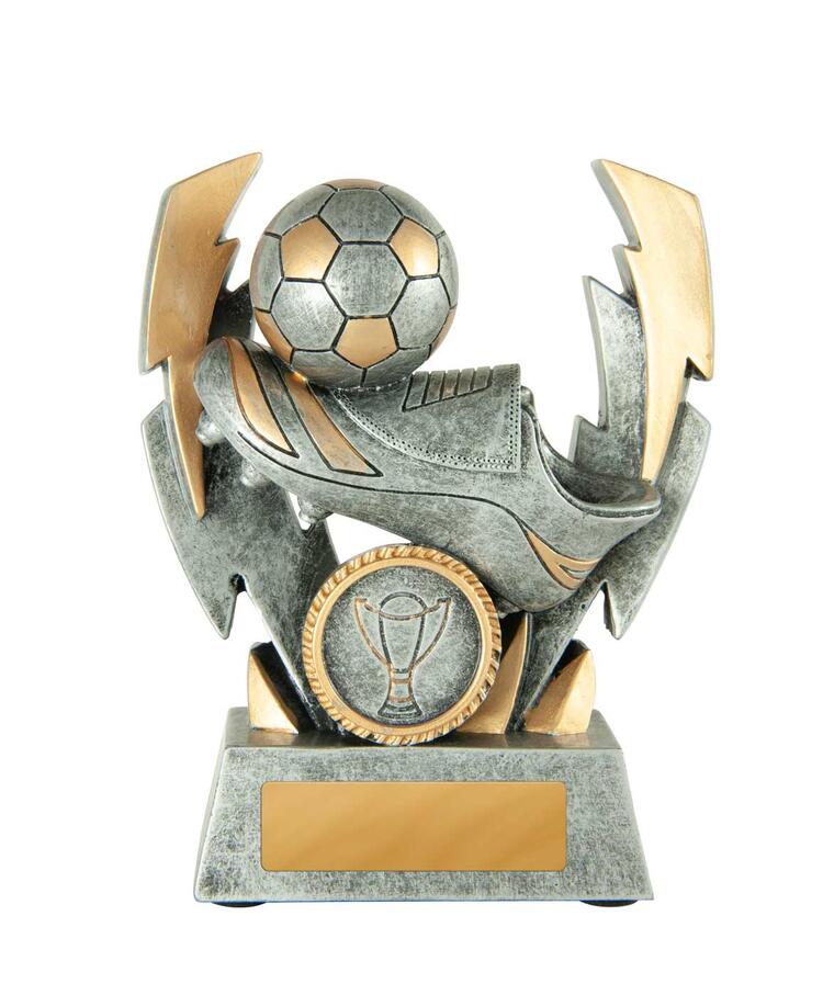 Showcasing a striking silver finish with gold accents, this double lightning strike football trophy features an energetic football and boot design, elevated by bold lightning motifs. Crafted from resin with a metallic look, it offers a professional and contemporary way to recognise football excellence.