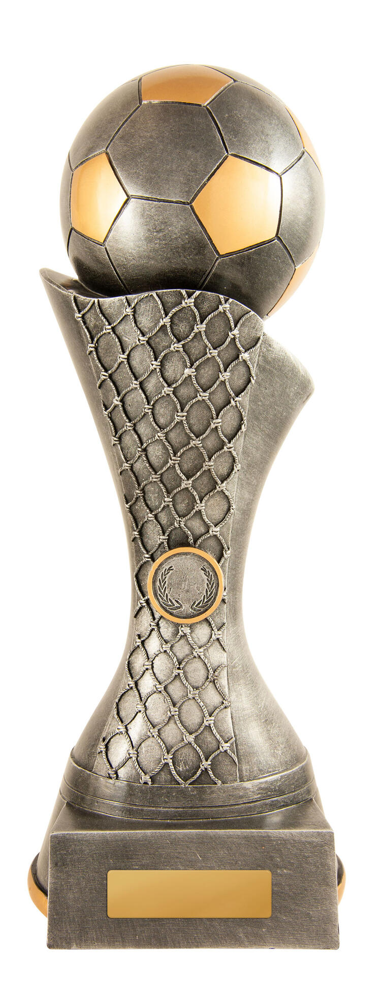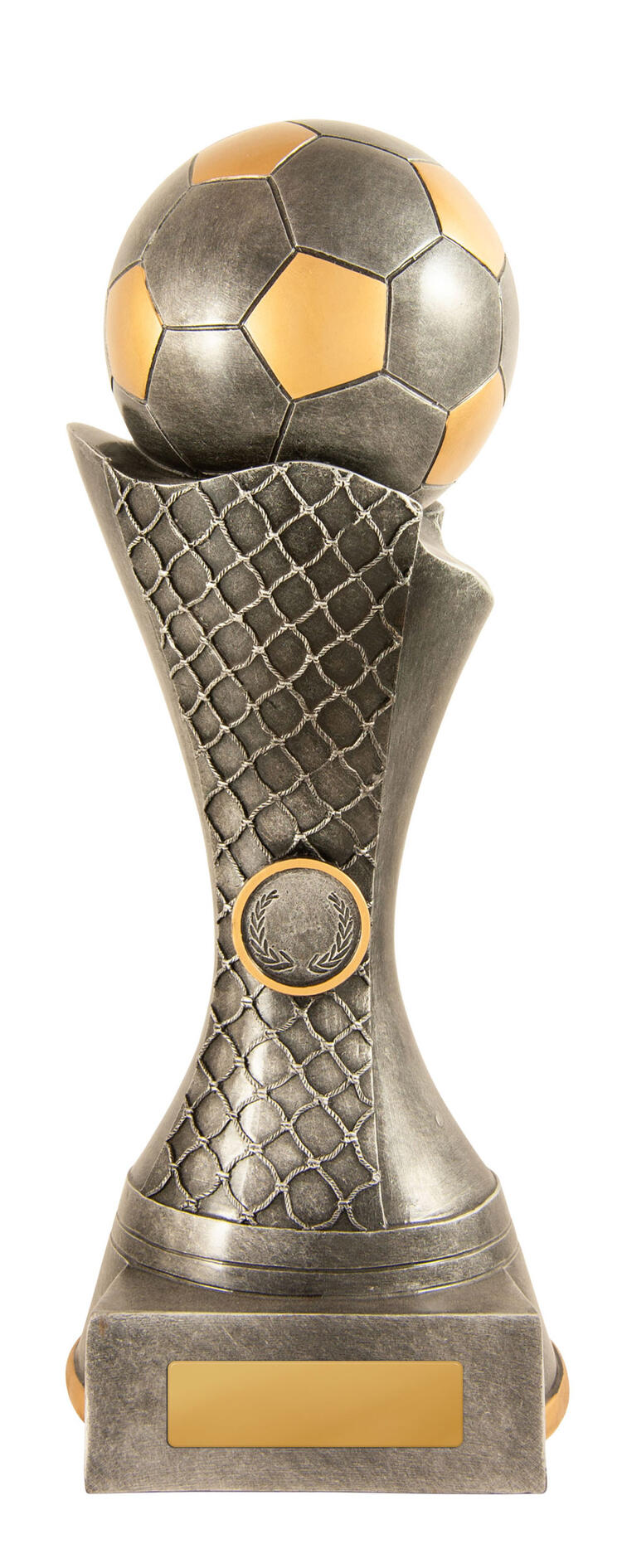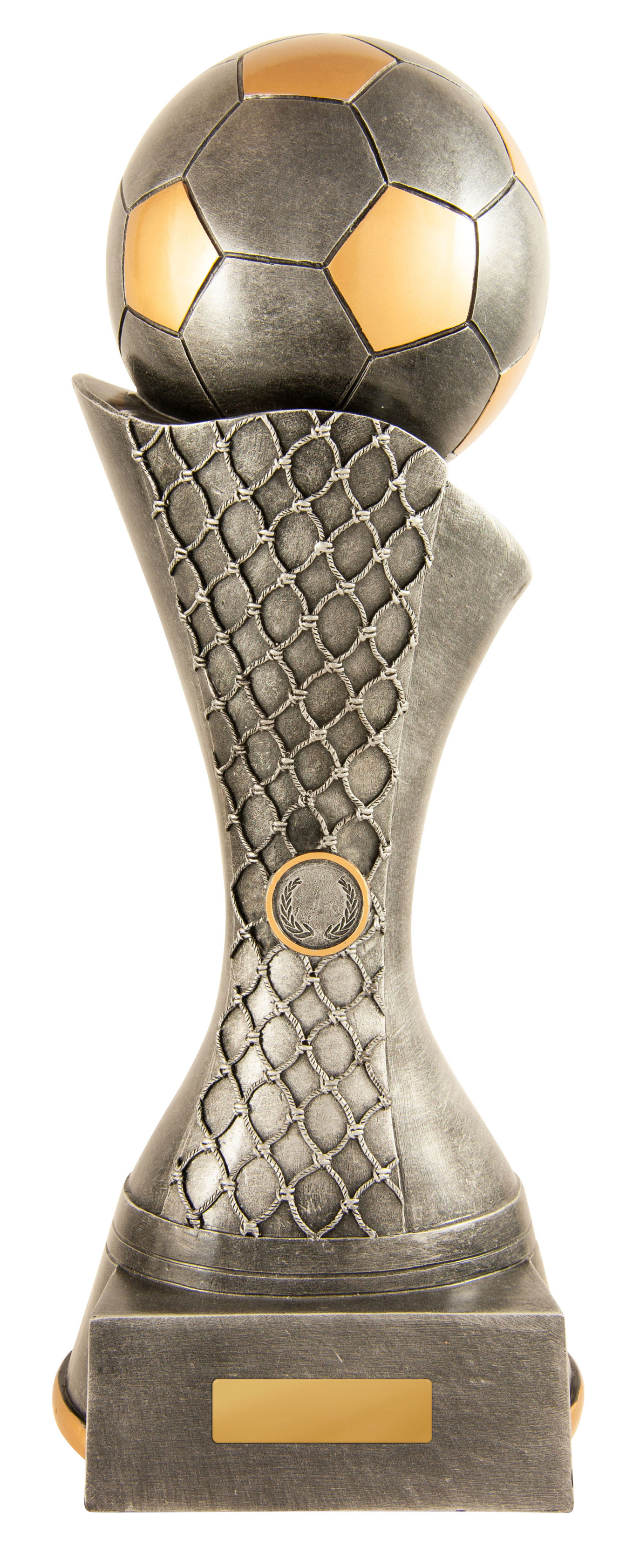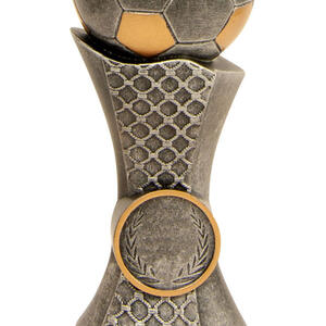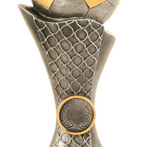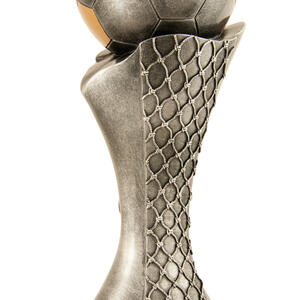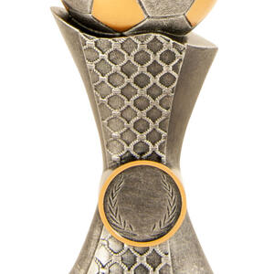 Celebrate sporting achievement with a distinguished trophy that blends tradition and contemporary style. This award showcases a gold and silver football perched atop a net inspired base, culminating in a three tiered wood platform. Crafted for impact, its generous size and customisable centre make it a standout choice for soccer trophies and football trophies at any ceremony.