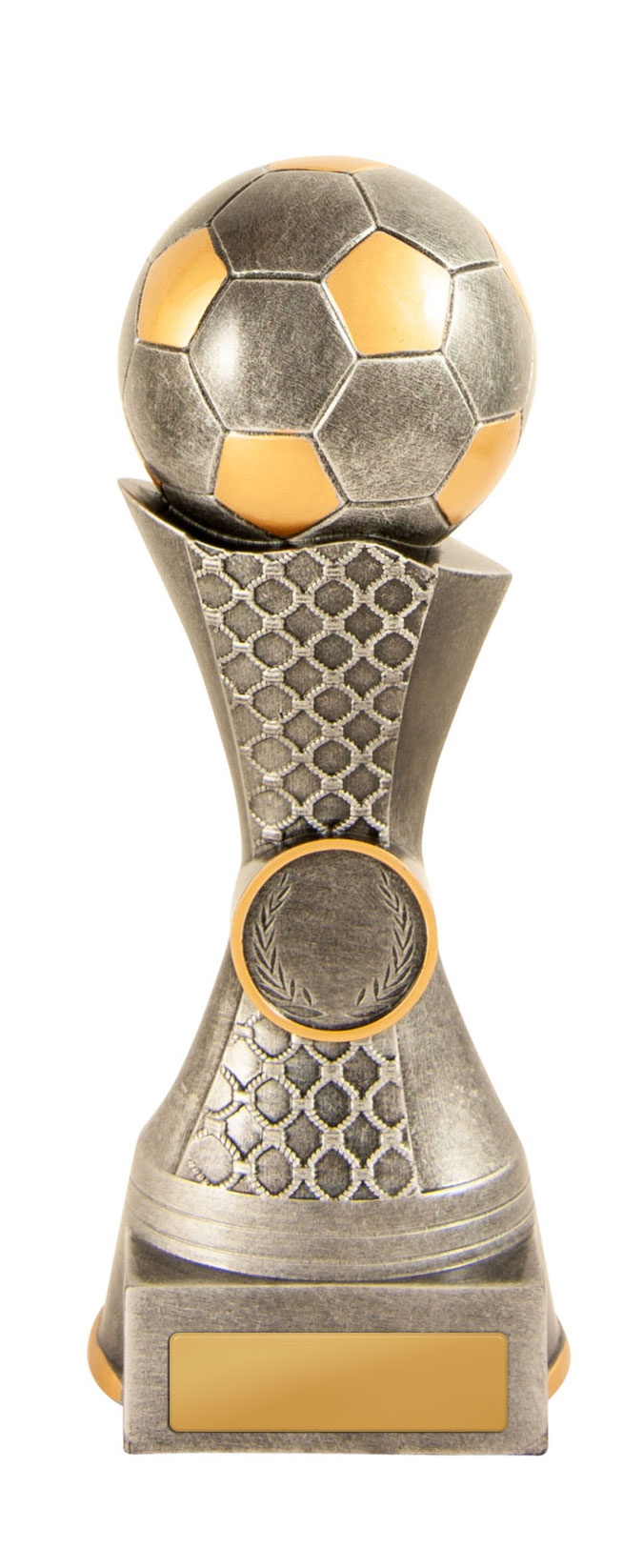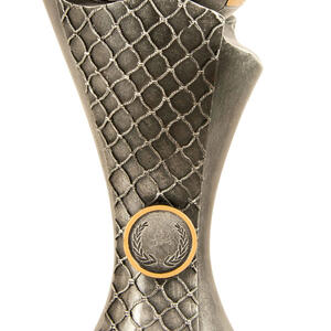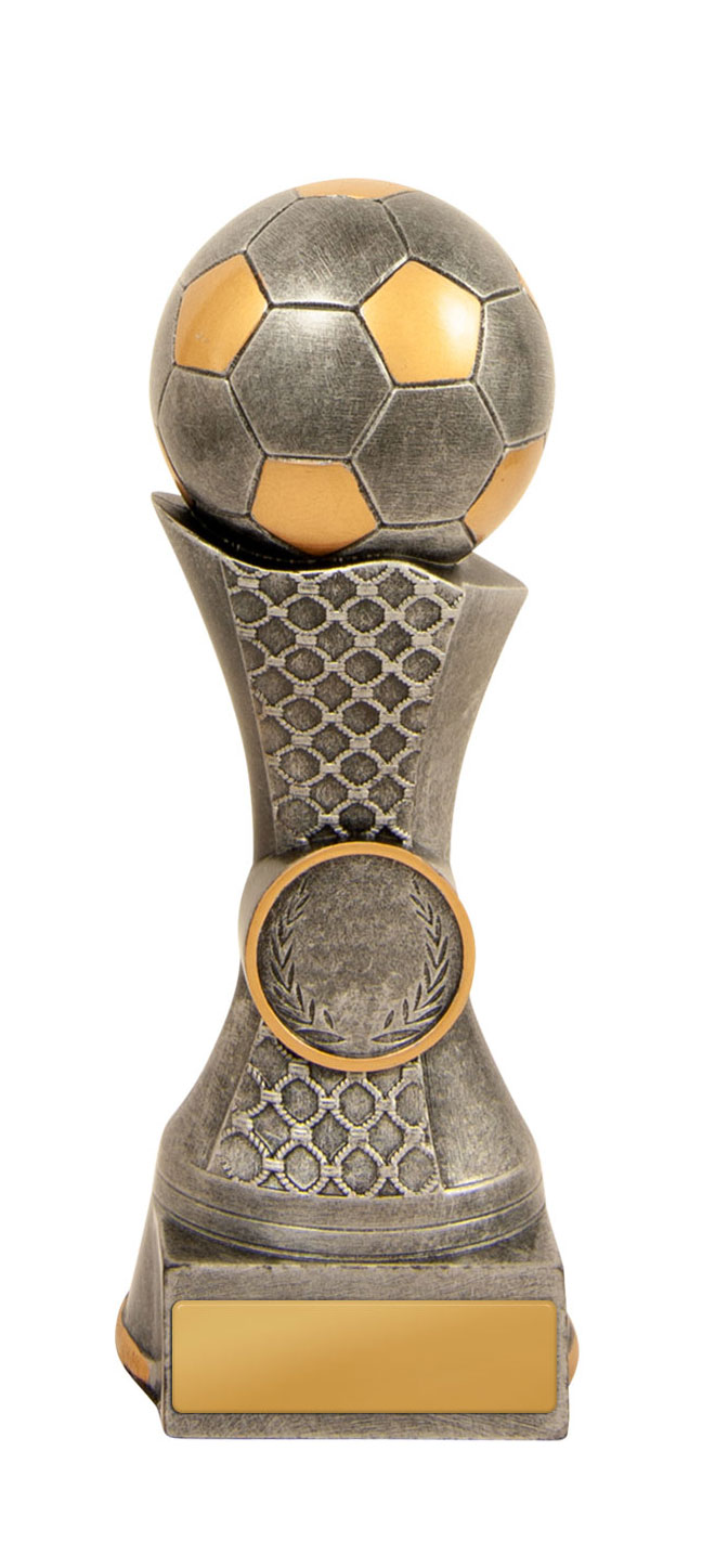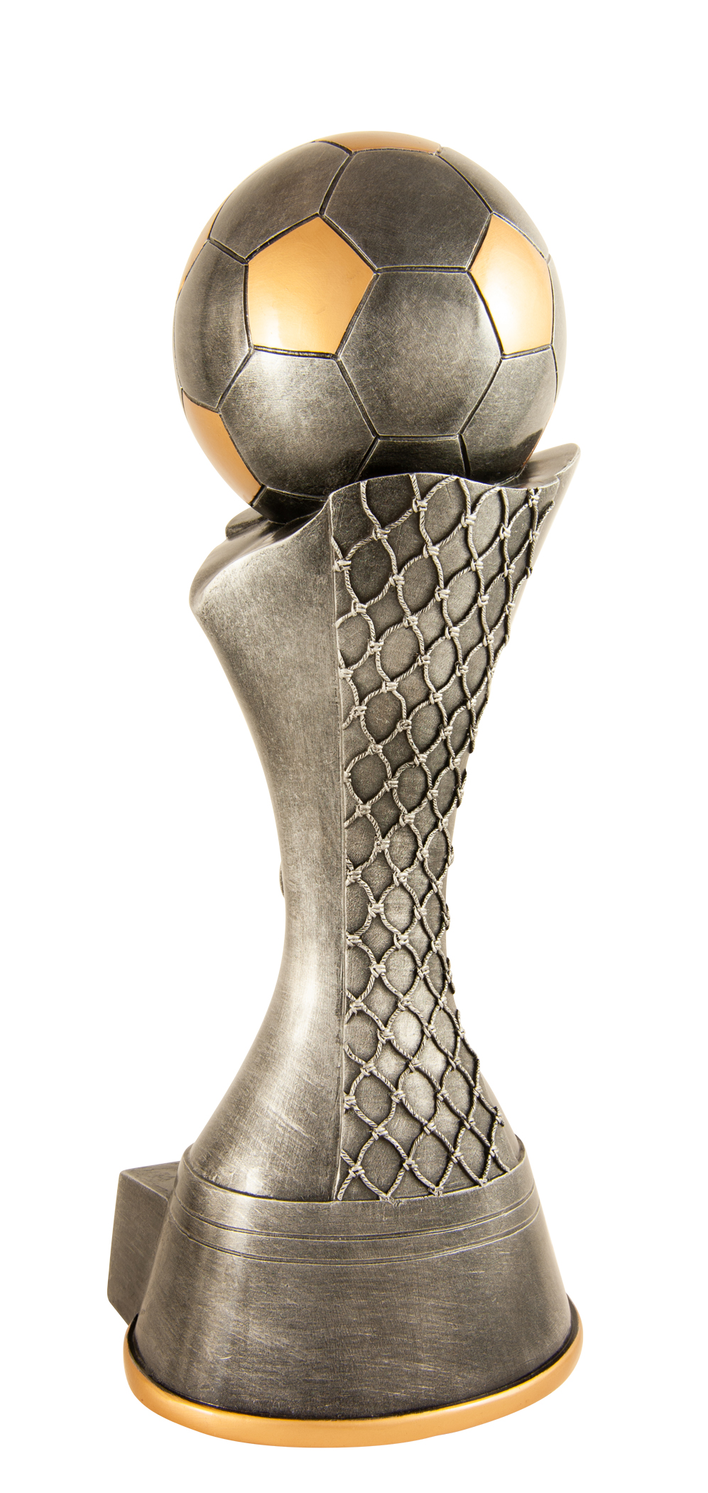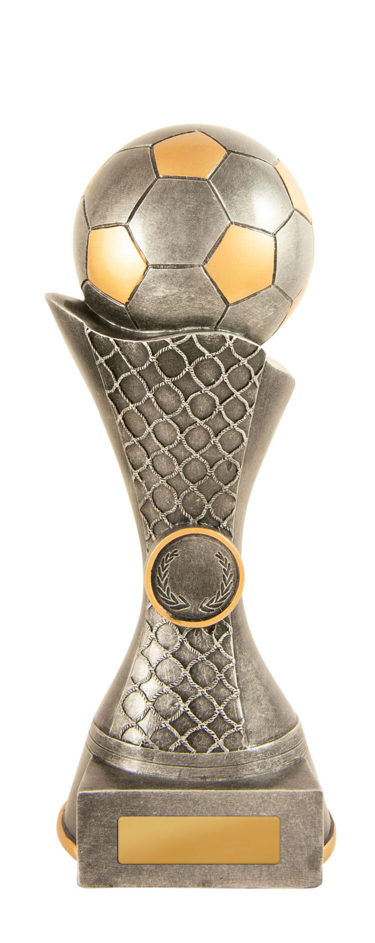 Celebrate sporting achievement with a distinguished trophy that blends tradition and contemporary style. This award showcases a gold and silver football perched atop a net inspired base, culminating in a three tiered wood platform. Crafted for impact, its generous size and customisable centre make it a standout choice for soccer trophies and football trophies at any ceremony.