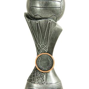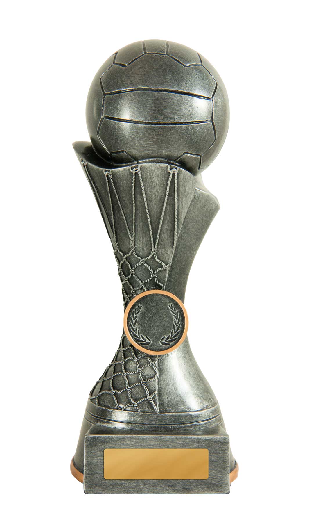 This contemporary netball trophy combines a striking silver finish with refined gold accents, making it a standout choice among netball trophies. A spherical top resembling a netball crowns the design, complemented by a laurel wreath motif and a flared base.