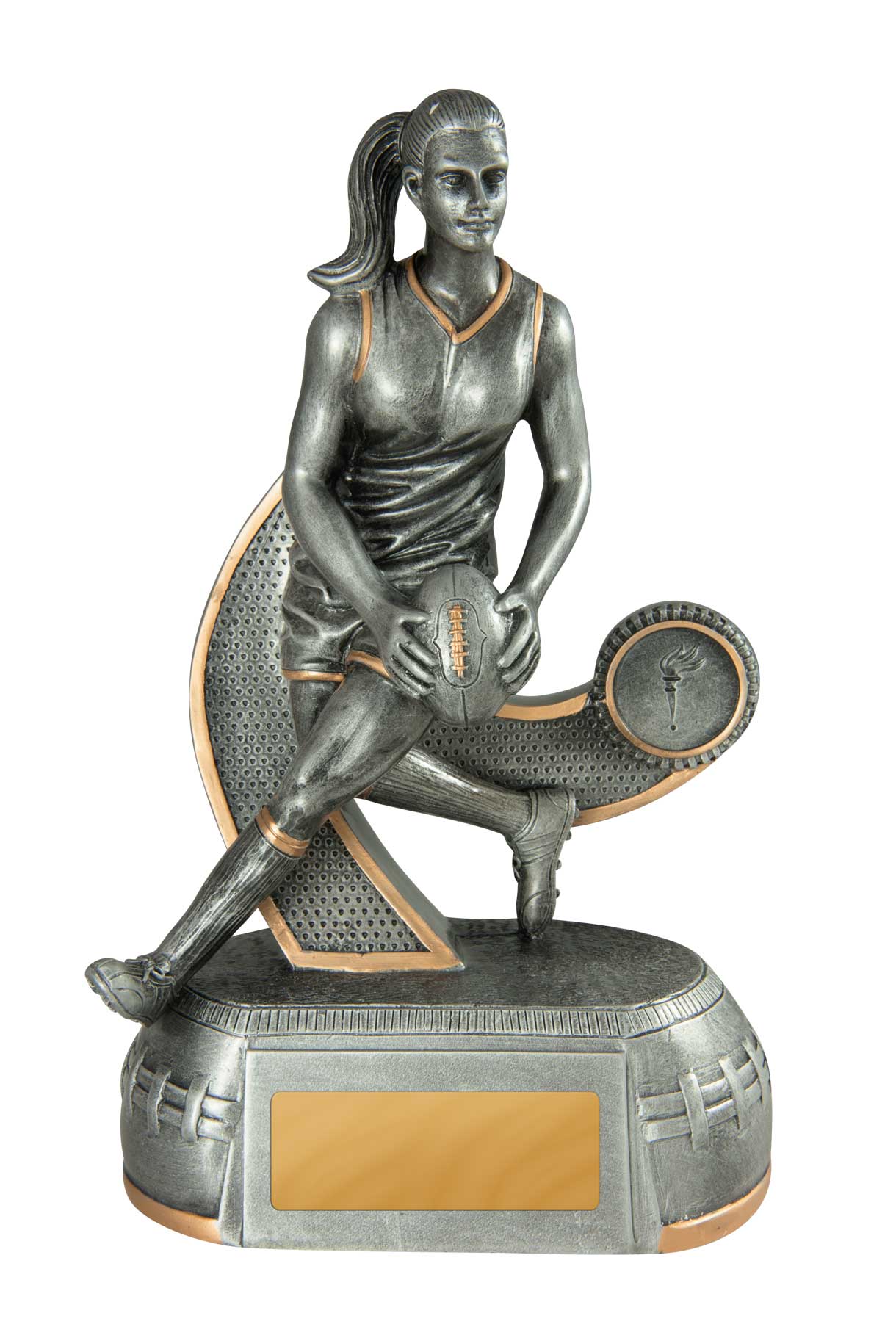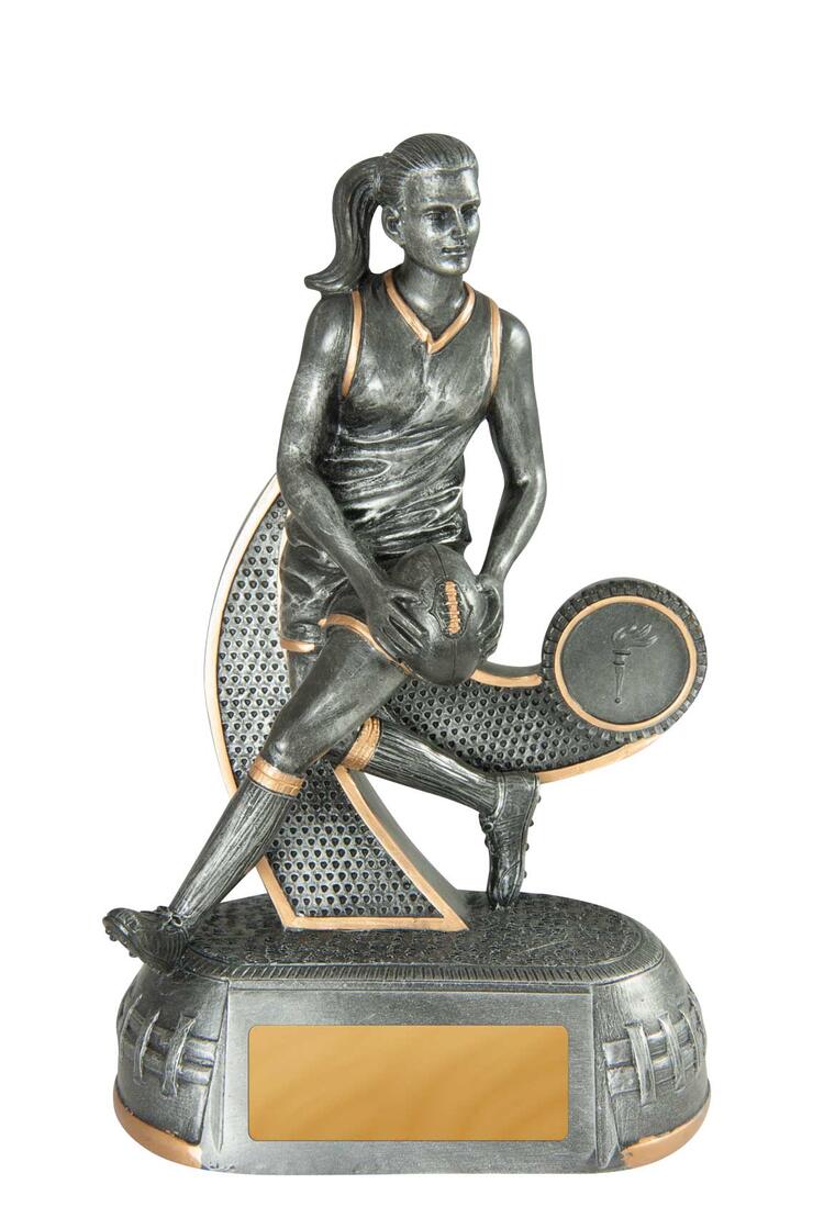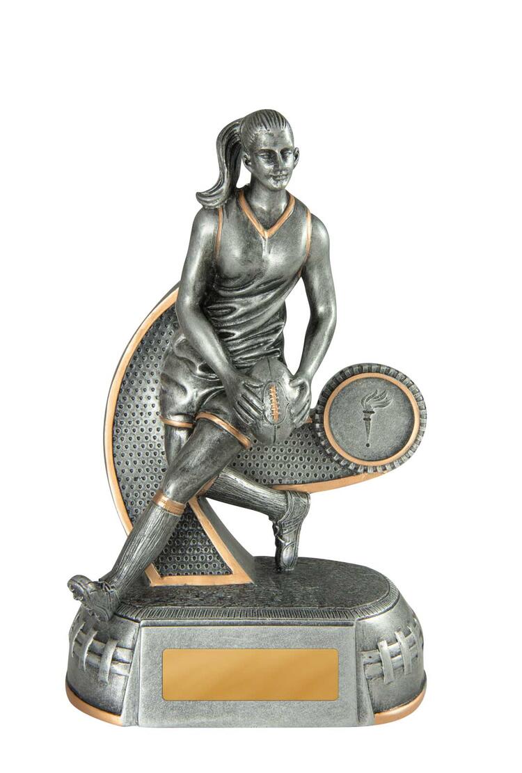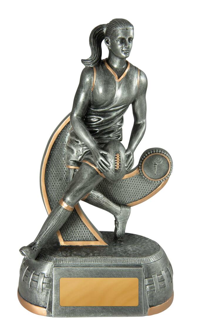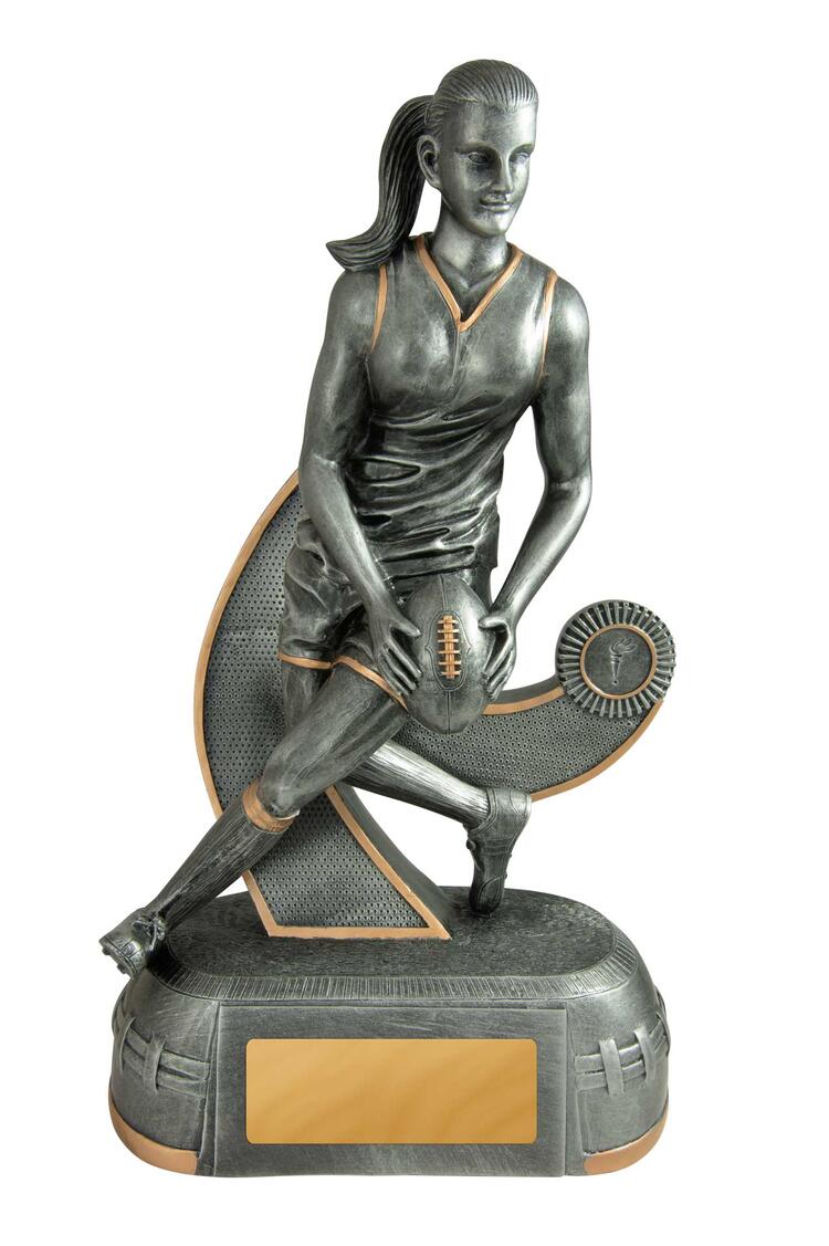 Celebrate achievement in women's Australian Rules Football with this elegant aussie rules trophy. Featuring a female player in dynamic action, each piece is crafted from durable resin with a metallic silver and gold-accented finish.