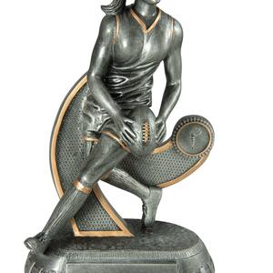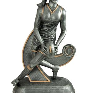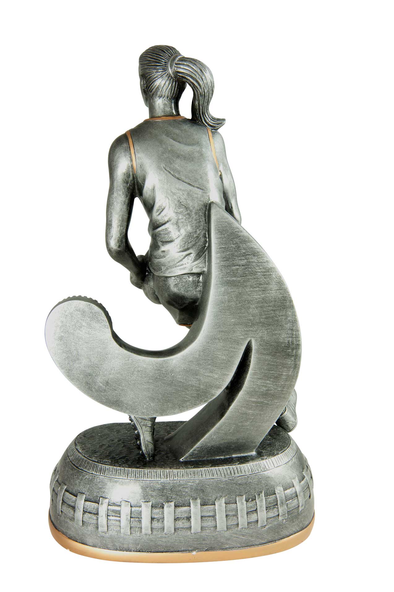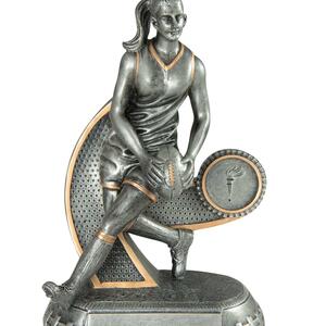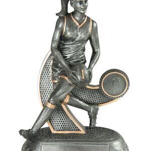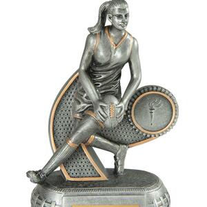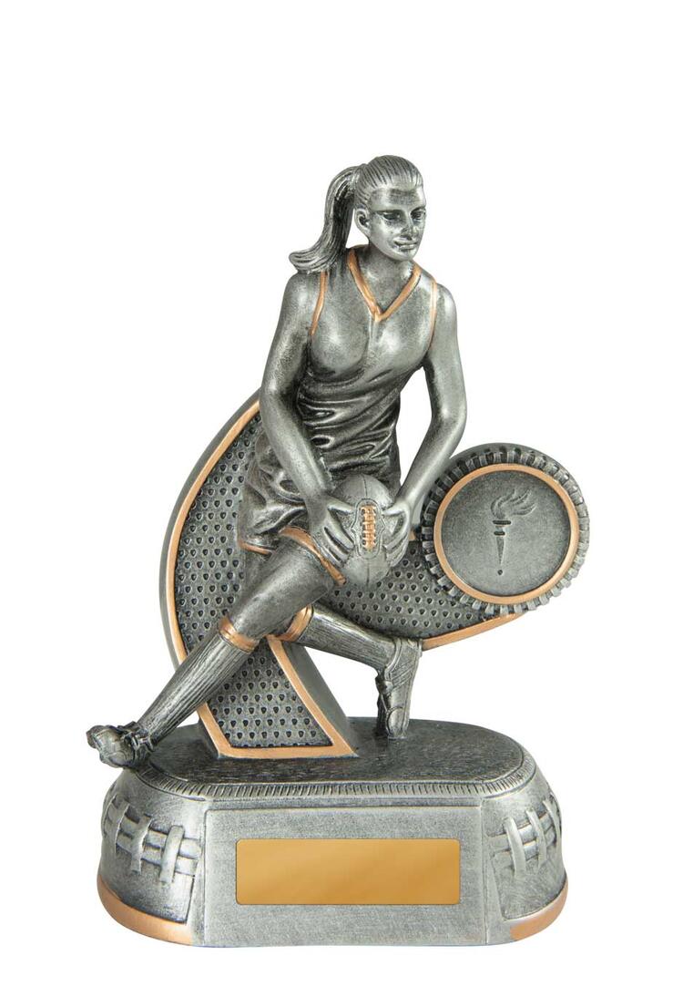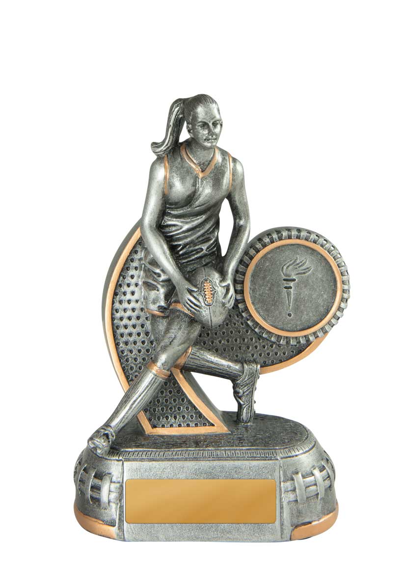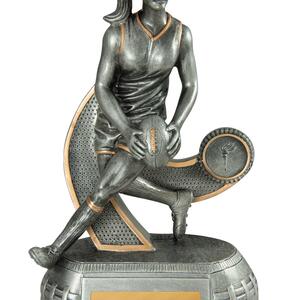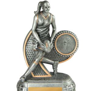 Celebrate achievement in women's Australian Rules Football with this elegant aussie rules trophy. Featuring a female player in dynamic action, each piece is crafted from durable resin with a metallic silver and gold-accented finish.