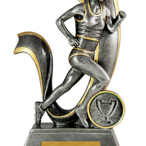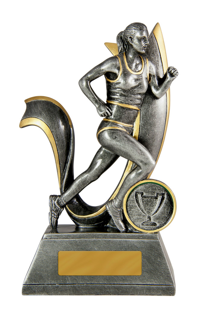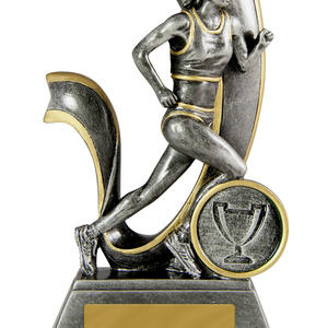 Celebrate outstanding achievement in women's athletics with this elegant trophy, crafted to recognise dedication on the track. Featuring a dynamic female runner figure, it is distinguished by scalloped detailing and a sturdy base. This is a trusted choice for athletics trophies, combining precision, durability, and refined style.