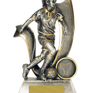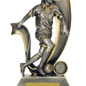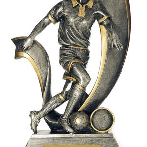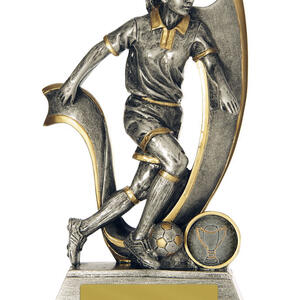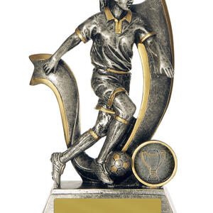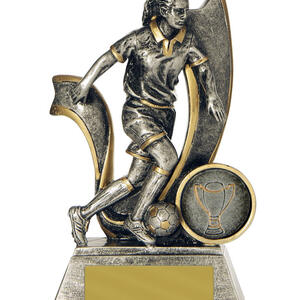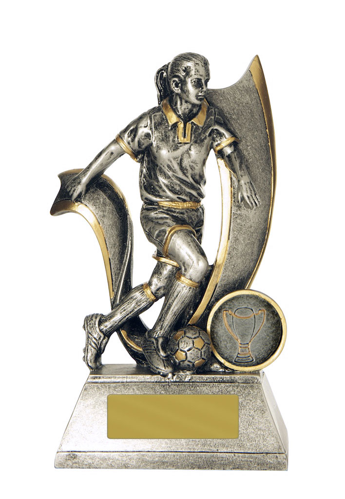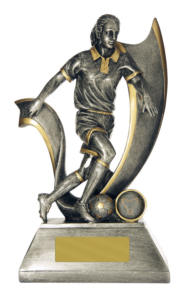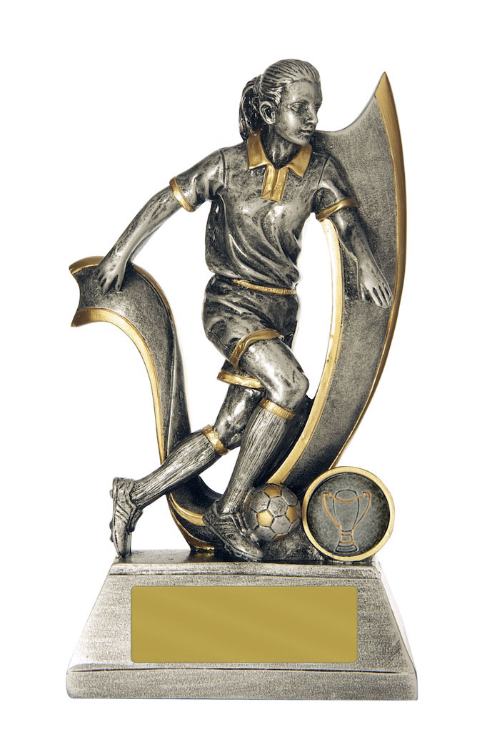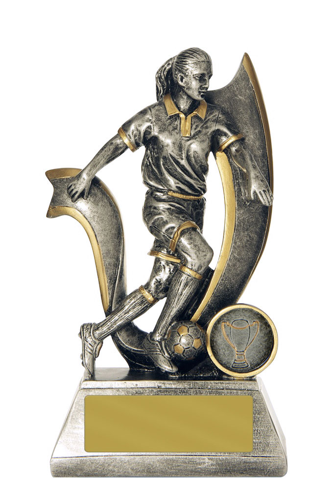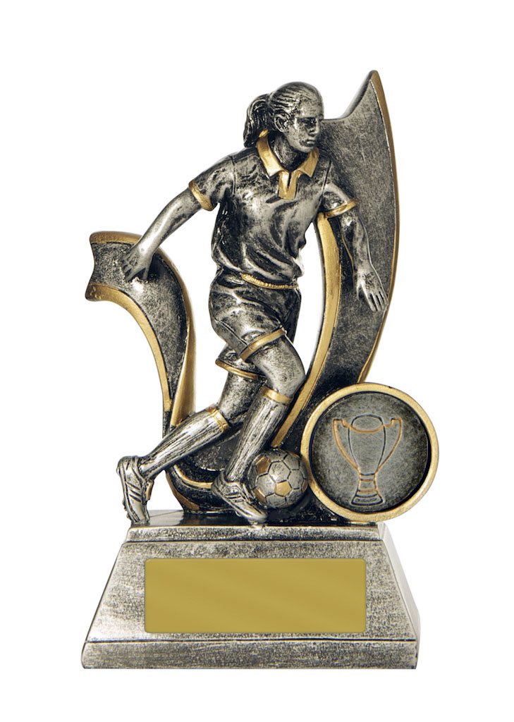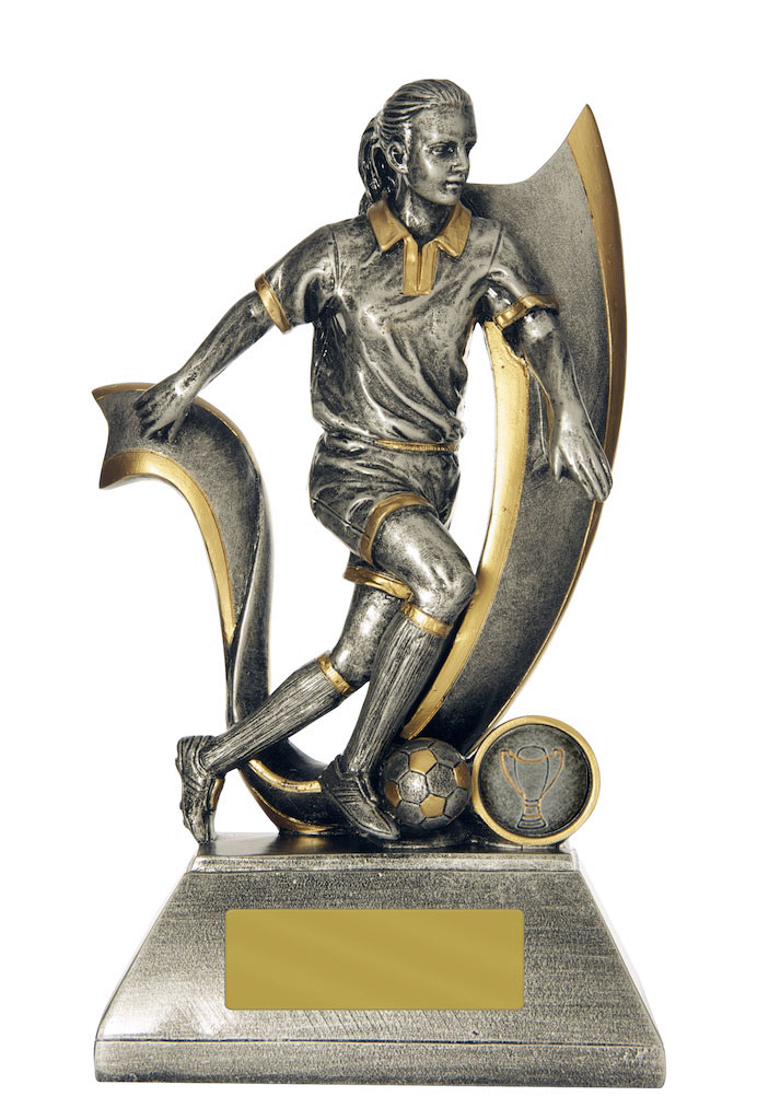 Celebrating excellence in women's football, this trophy features a dynamic female player in motion, crafted in premium gold and silver tones. The curved design and scalloped lines convey energy, while the circular base provides stability. A football and trophy emblem complete this elegant award, making it a distinguished choice for soccer awards and memorable achievement.