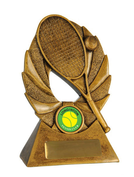 This classic tennis trophy features a detailed racquet and ball framed by golden laurel leaves. Made from antique gold resin, it includes a round insert area for your custom logo and an engraving plate below. Ideal for junior and senior tennis presentations.