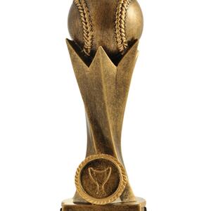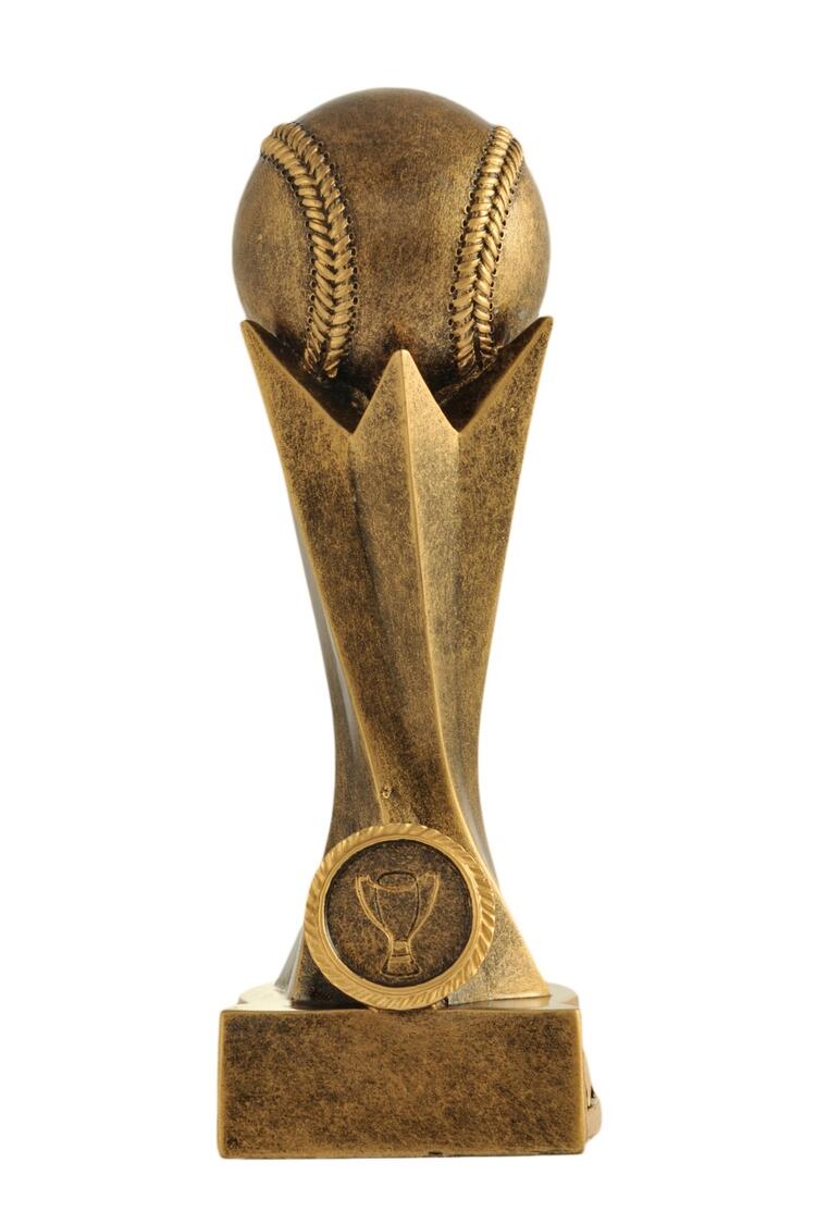 Celebrate sporting success with this impressive star themed trophy, showcasing a baseball glove, bat, and ball surrounded by golden stars. Crafted from resin and finished in antique tones. Includes engraving plate.