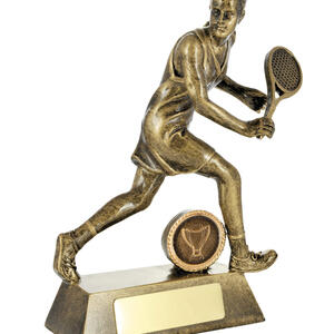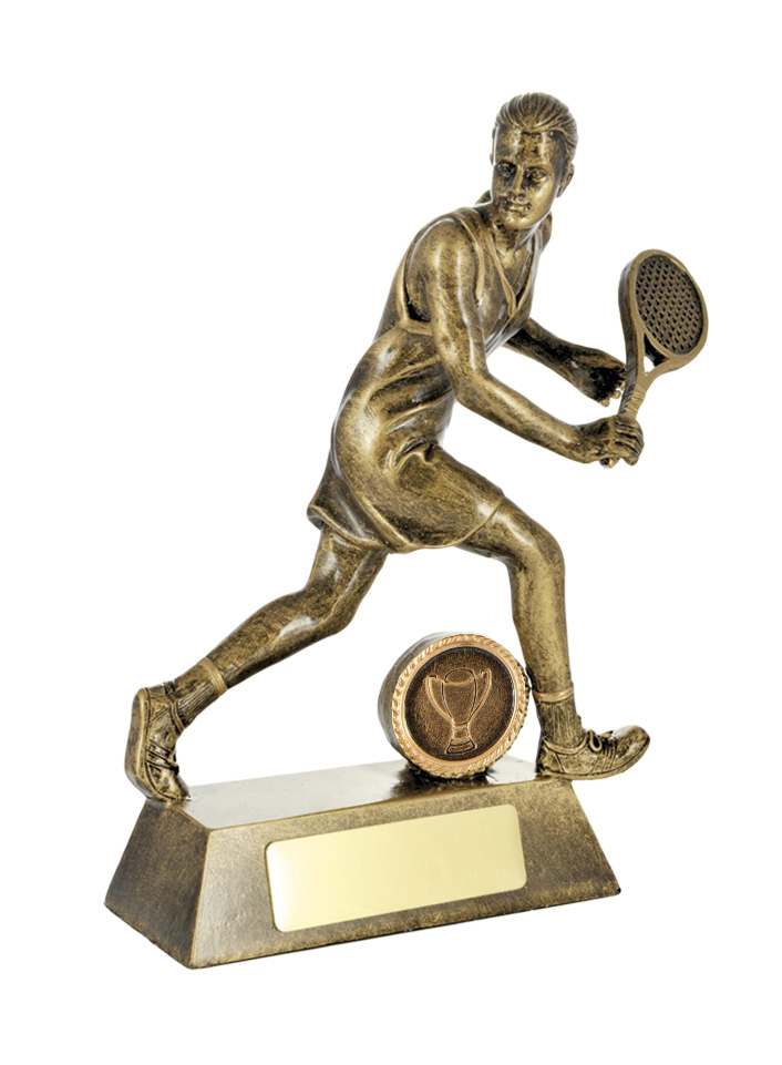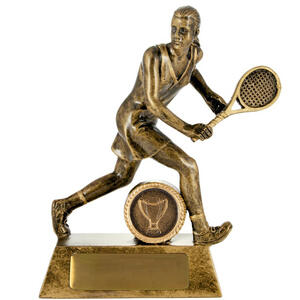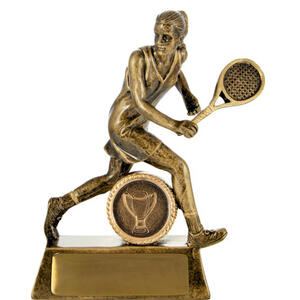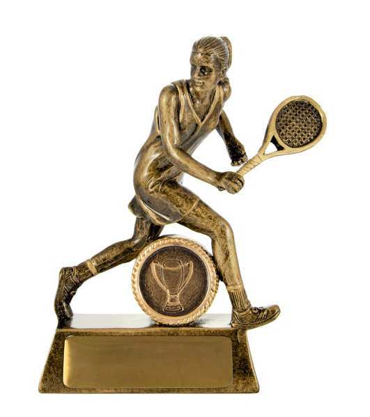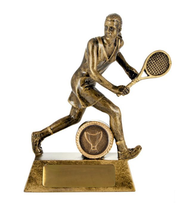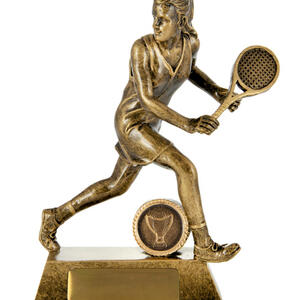 Celebrating achievement on the court, this striking tennis trophy features a poised female figurine holding a racket, finished in warm gold and bronze tones. Crafted from resin, each award rests on a sturdy rectangular base with a circular trophy emblem, offering a refined addition to tennis trophies collections or as a distinctive desk accent for sports enthusiasts.