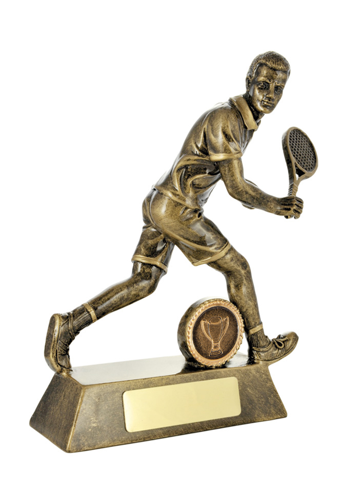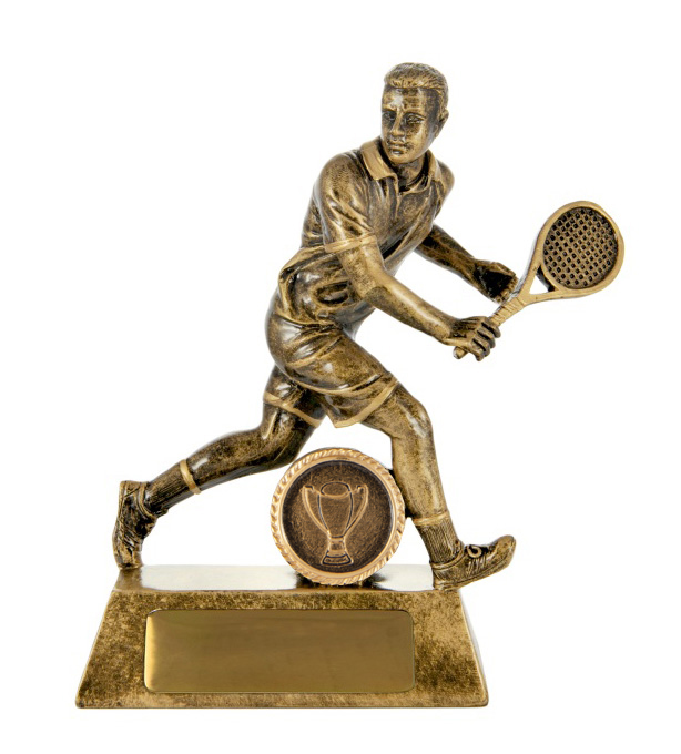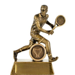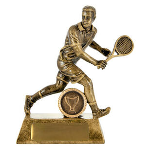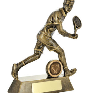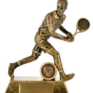 Capturing the energy of the game, this tennis trophy features a male player in a dynamic stance, poised for action with racket in hand. The design combines gold and bronze finishes for a classic, celebratory look, while the sturdy rectangular base offers a touch of elegance. Ideal for tennis trophies presentations, this piece recognises dedication and achievement in sport.