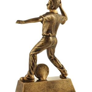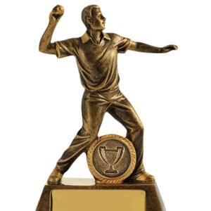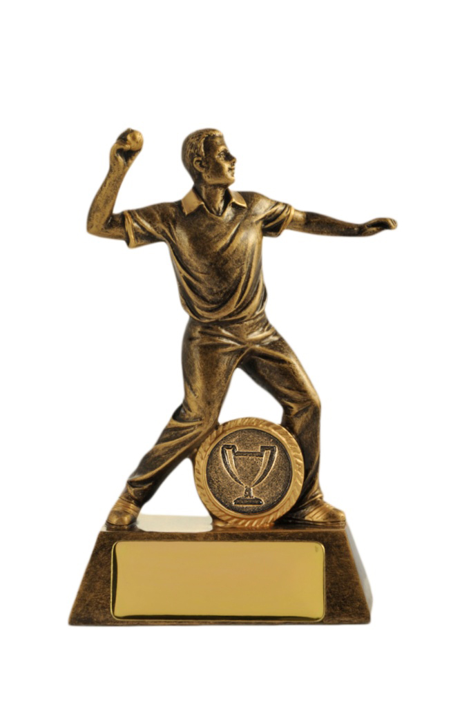 This cricket trophy features a dynamic bowler captured mid action, finished in gold with antique bronze highlights for a refined, professional look. Crafted from resin and mounted on a sturdy base, it includes a blank plaque for custom engraving. This cricket fielder trophy is crafted to recognise standout fielding or bowling achievements with distinction.
