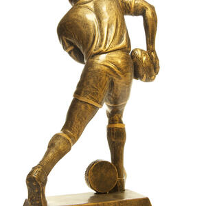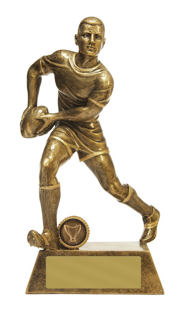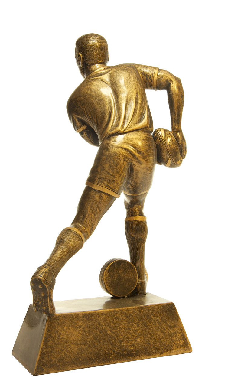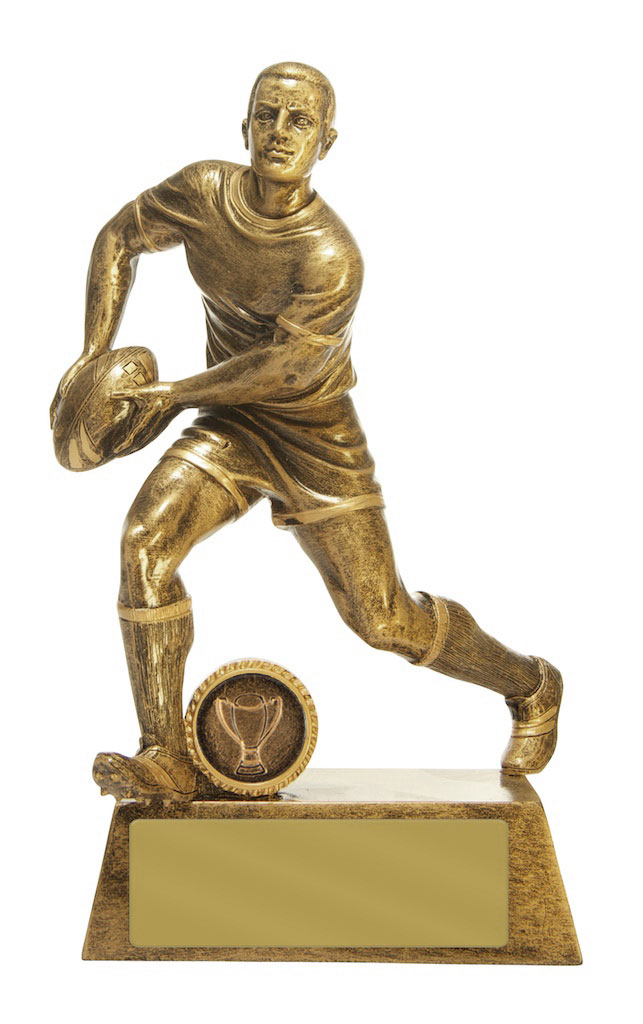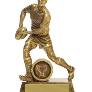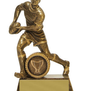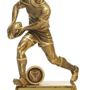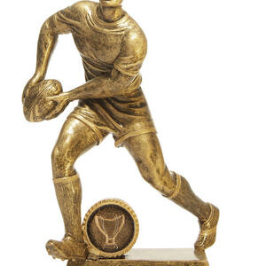 Celebrate rugby achievement with this striking rugby trophy, featuring a bronze figurine of a player in mid action holding a rugby ball. The detailed 3D finish captures movement and focus, while the gold toned figure stands proudly on top a solid base.