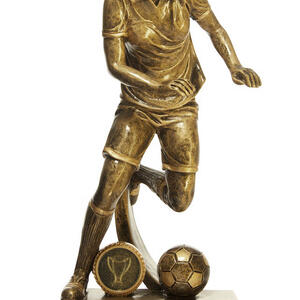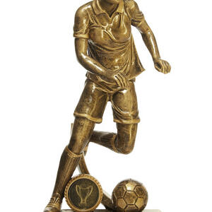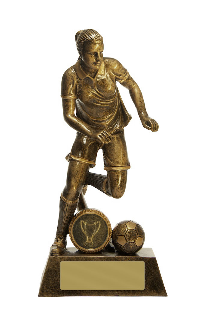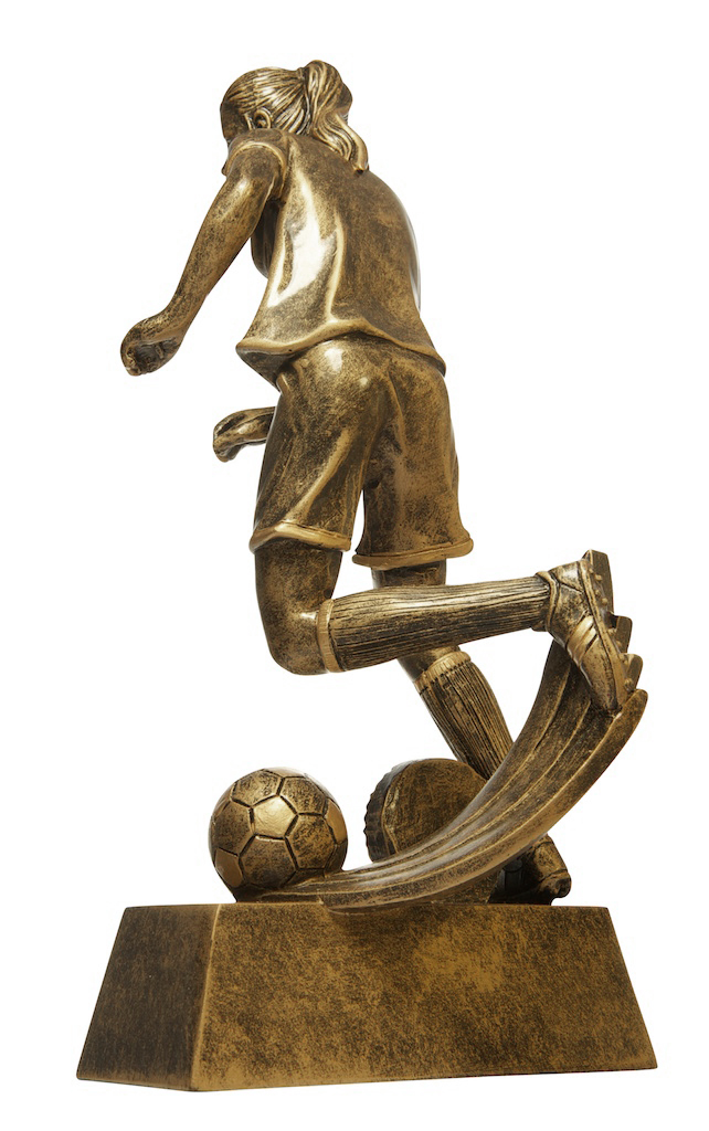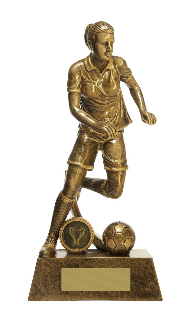 Crafted for standout recognition in women's football, this gold finished soccer trophy features a dynamic female player in motion atop a solid rectangular base. The design is highlighted by a football and trophy emblem, incorporating a striking lightning bolt motif for added impact.