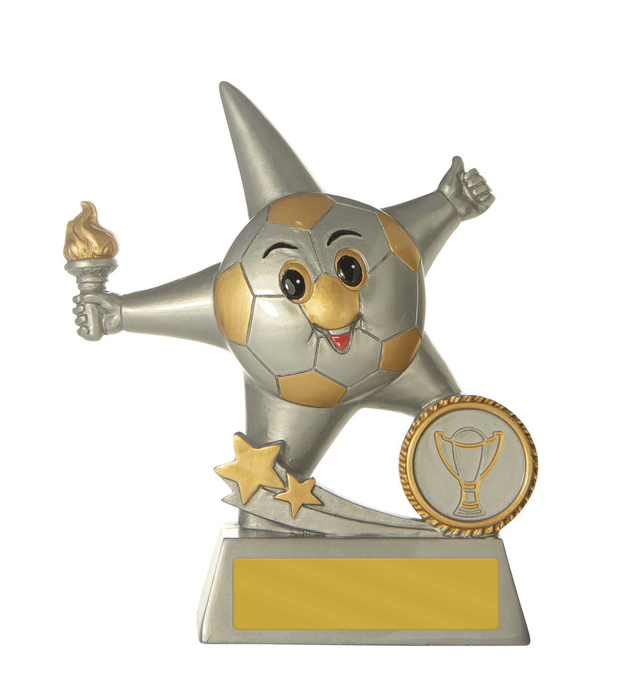 Celebrate young sporting achievement with this charming football trophy, featuring a cheerful football character holding a torch within a bold star design. Crafted from resin, it combines playful detail with lasting quality. This soccer award is ideal for schools, clubs, and competitions seeking a memorable, personalised recognition piece.