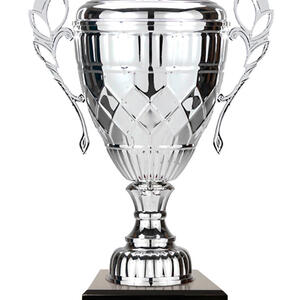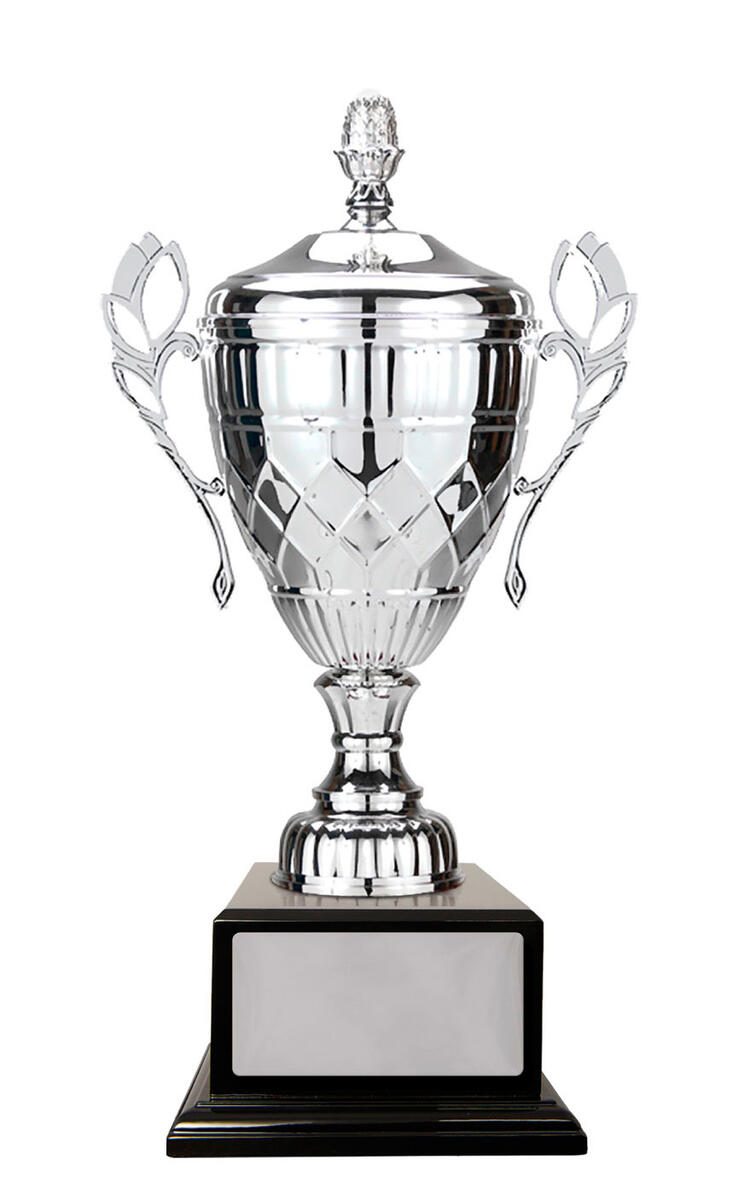 A classic winners cup, the Whopper Cup Silver combines elegant silver metal with a sturdy black base for a distinguished presentation. Featuring a refined cup design, complete with handles and a decorative lid, this silver cup trophy is suited for a wide range of sporting and achievement celebrations.