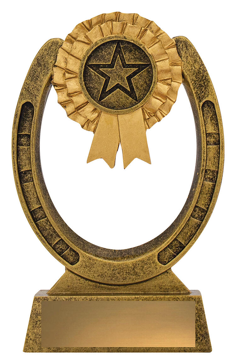 This award combines the timeless symbols of equestrian success - a detailed horseshoe with a rosette and star emblem at the centre. Cast in antique gold resin with textured detailing, itÂ’s an excellent choice for general horse awards, stable competitions, participation trophies or special recognition. The open horseshoe design gives it a light, stylish appearance.