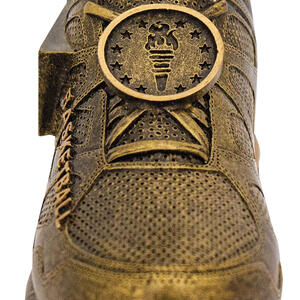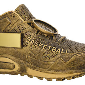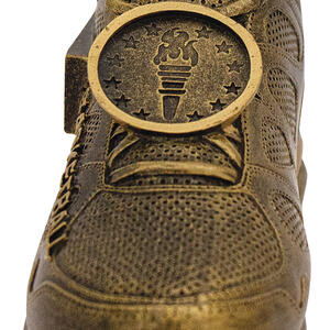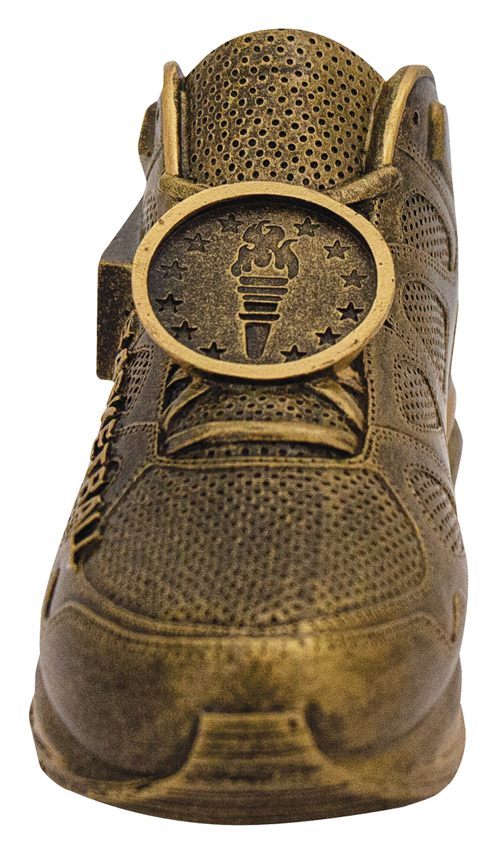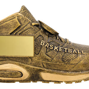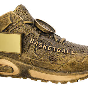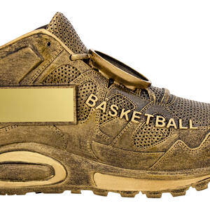 Distinguished by its unique shoe shaped design and radiant gold finish, this trophy brings a fresh perspective to basketball trophies. Featuring the word 'Basketball' and a torch emblem surrounded by stars, it symbolises achievement and dedication on the court. Its metallic construction ensures a lasting, elegant memento for players and teams alike.