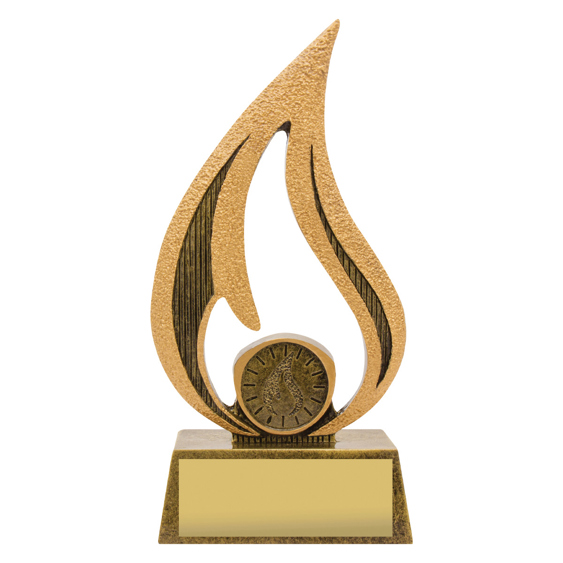 A Flame Achievement Trophy features a bold golden flame silhouette that represents passion and dedication. This modern resin design is perfect for recognising outstanding effort and spirit across all events. Supplied with an engraving plate for your custom text.
