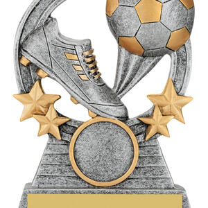 This elegant trophy features a dynamic football and boot design, accented by decorative stars and finished in classic silver and gold tones. A trusted choice for soccer trophies, it provides a memorable way to recognise sporting excellence at any event.