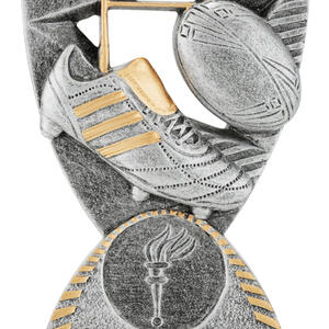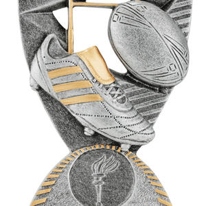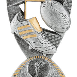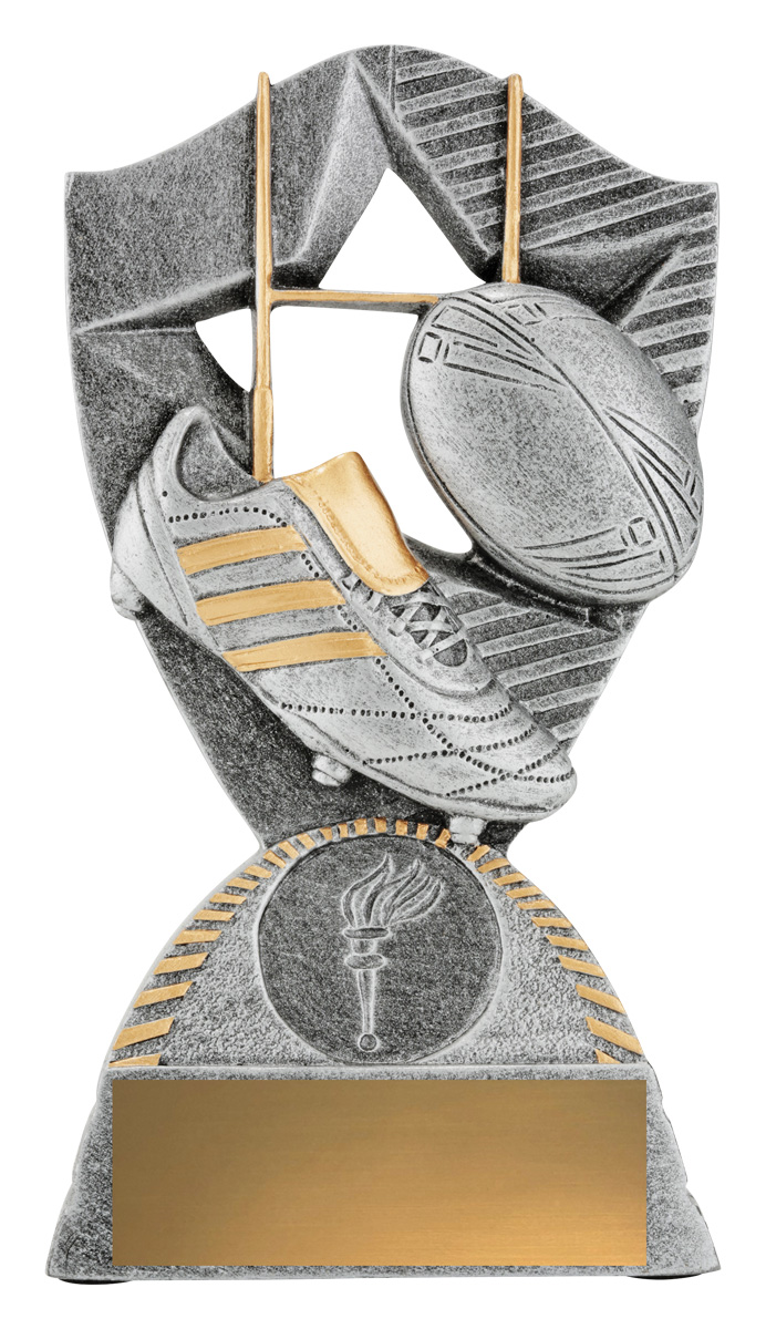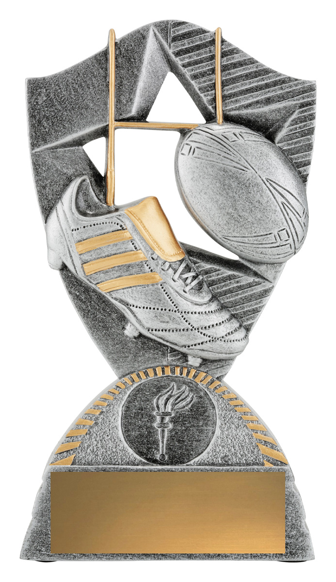 Distinguished by its shield-inspired form and sophisticated metallic finish, this rubgy trophy stands out as a symbol of sporting excellence. Silver and gold elements accentuate the detailed depiction of a rugby ball, boot, and goalposts, capturing the skill and spirit of the game. Crafted for enduring recognition, it is an elegant tribute to achievement in rugby.