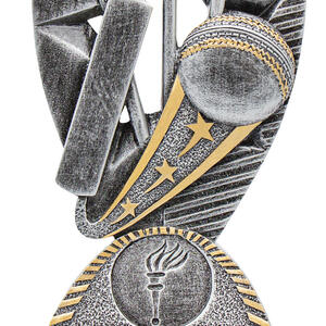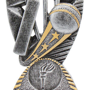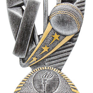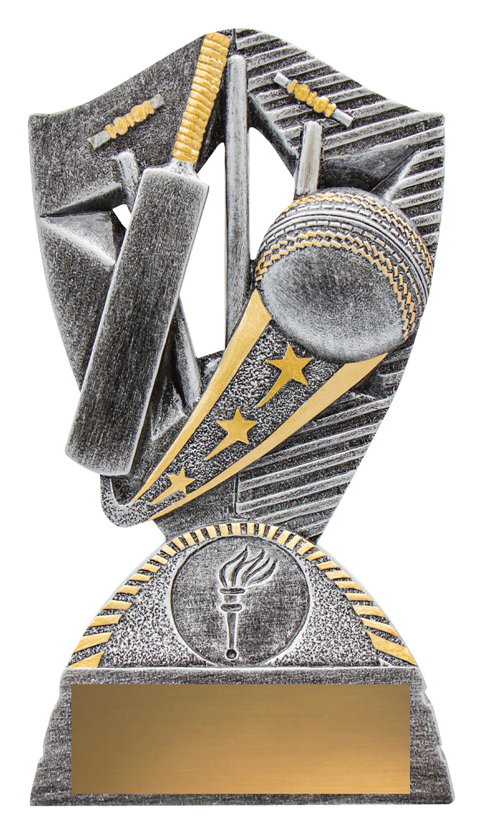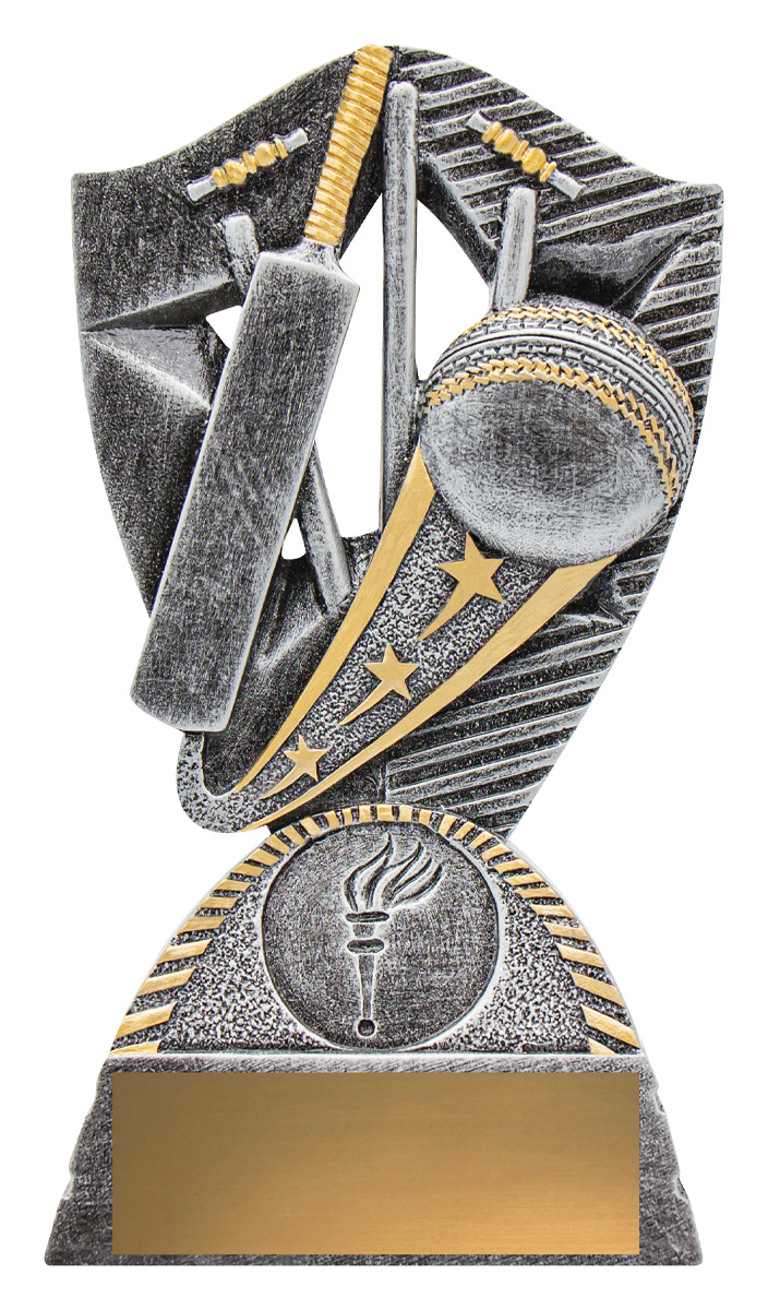 Showcasing a bold shield and base, this trophy features a detailed cricket bat, ball, and stumps design in an elegant silver and gold finish. Crafted from resin it offers both durability and a polished look, making it a trusted choice for cricket trophies. This award celebrates sporting achievement with clarity and style.
