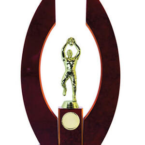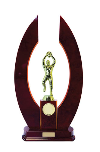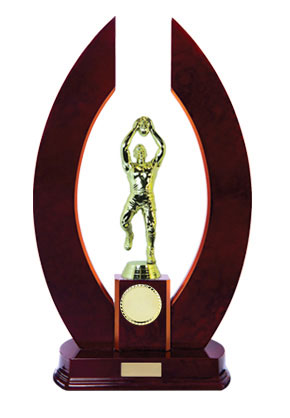 Showcasing a golden player in action, this aussie rules trophy combines a vintage inspired metal figurine with the natural elegance of a timber arch and sturdy rectangular base.