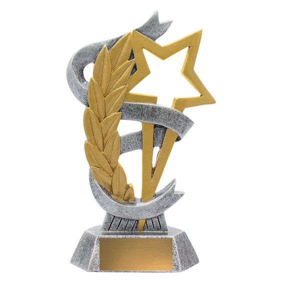 With a unique swirl design and laurel accent, this silver and gold resin trophy celebrates outstanding performance. The open star shape creates a contemporary and eye catching presentation piece.