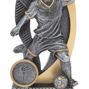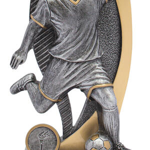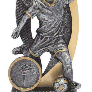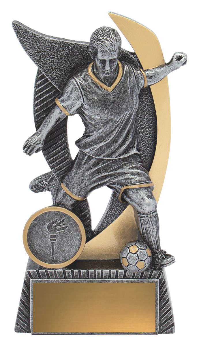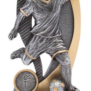 An inspired choice among football trophies, this piece showcases a silver and gold male footballer captured mid play, complemented by a symbolic torch emblem. Crafted for memorable recognition, it celebrates dedication and sporting achievement.