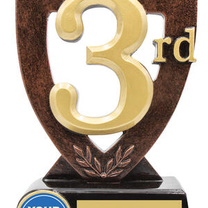 This shield shaped award stands out with its elegant gold and black finish, crafted for general achievement recognition. The sturdy rectangular base supports a bold shield design, highlighted by a prominent gold '3rd' and a circular area ready for your logo. Durable resin and a classic profile make it a trusted choice for lasting recognition.