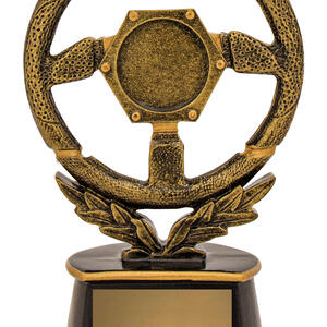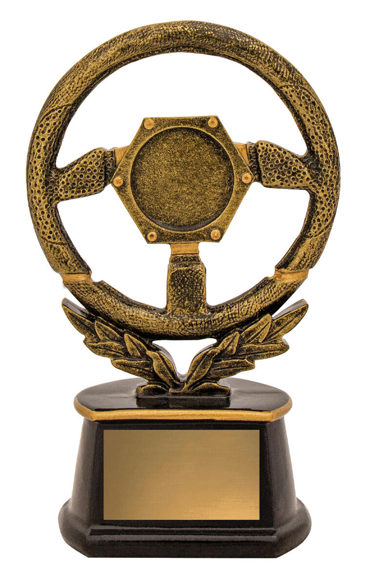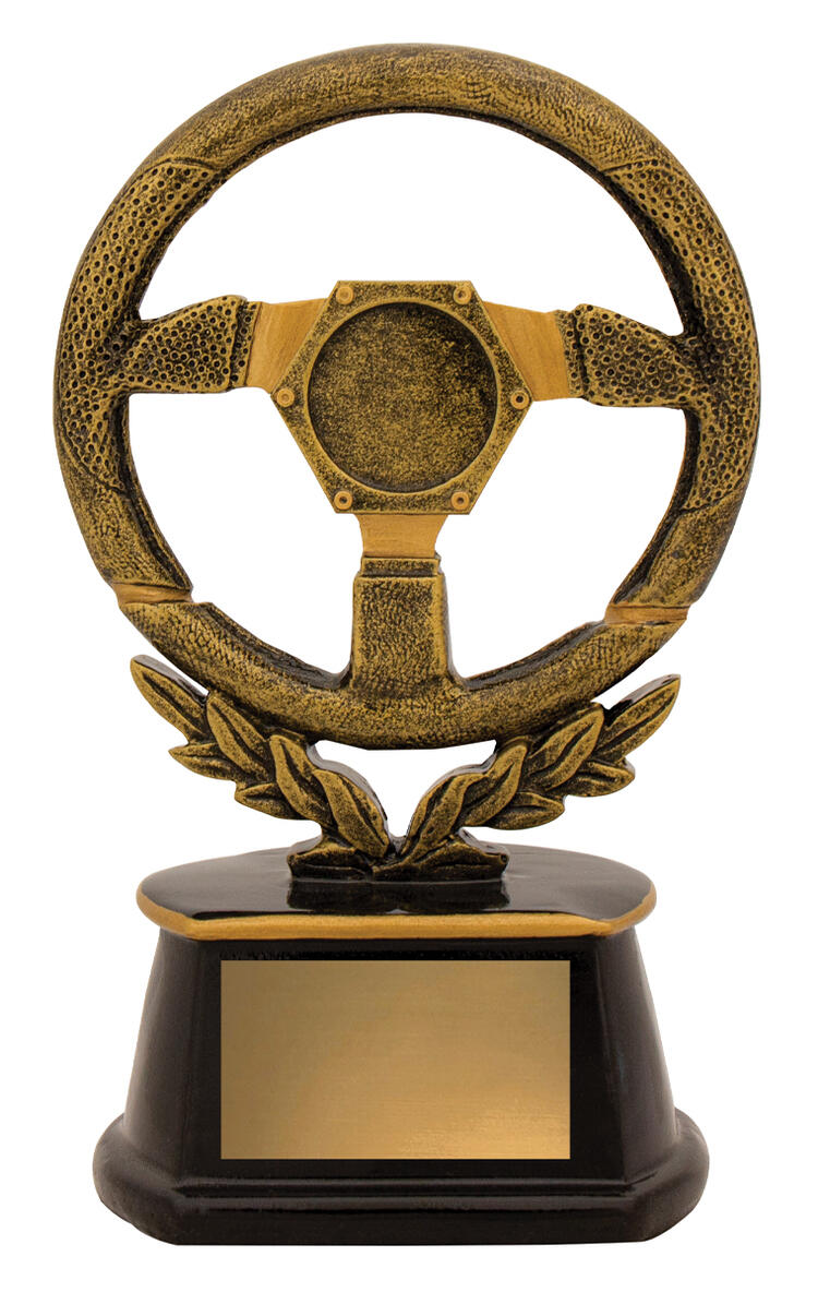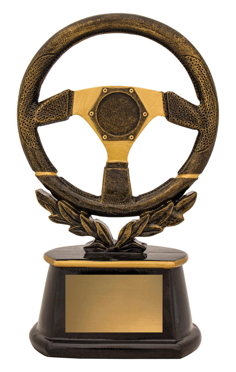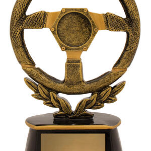Celebrate motorsport excellence with this steering wheel trophy, crafted in resin for lasting quality and distinction. The gold and black finish brings a refined look to the dynamic steering wheel design, while the laurel wreath at the base symbolises achievement. A sophisticated choice for honouring standout performances in racing and automotive events.