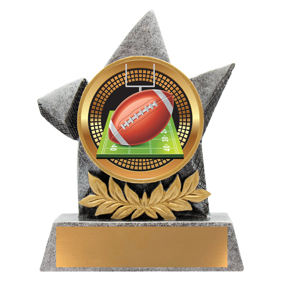 This compact resin trophy combines silver and gold tones with a circular insert frame designed to feature your custom club logo or a standard gridiron image. A modern option for team awards and participation trophies.