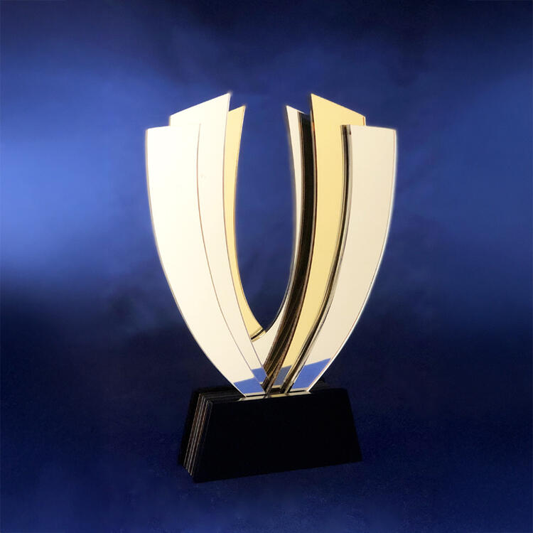 This elegant acrylic award features layered mirror gold and silver panels rising from a sleek black base, creating a sense of movement and sophistication.