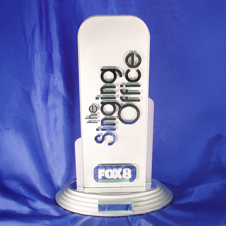 A striking custom trophy designed for Fox8s The Singing Office. Crafted from layered acrylic with precision laser cut lettering and shapes, this contemporary award features a stepped gloss silver base that adds height and prestige.