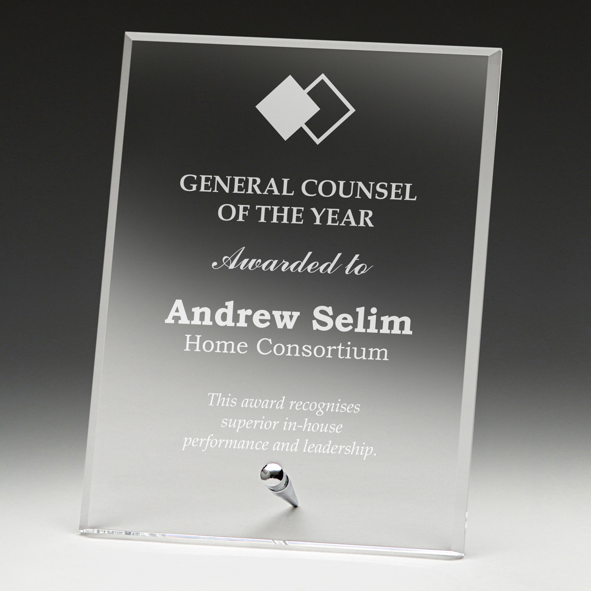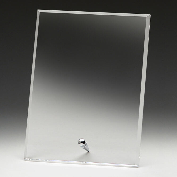 This acrylic award combines the clarity of acrylic with the sleekness of silver metal for a distinguished presence. Its rectangular form and freestanding design, supported by a sturdy metal peg, make it a reliable and stylish choice for professional recognition. Crafted for durability and visual impact, this piece is ideal for commemorating achievement in any setting.