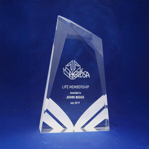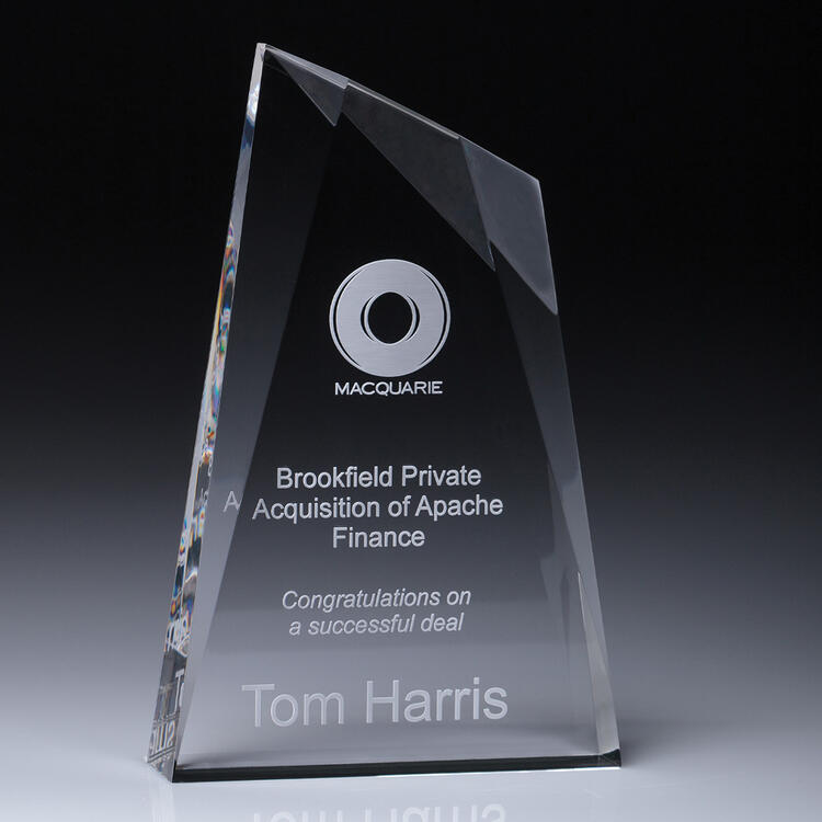 This acrylic award features a clear, asymmetrical prism design meticulously crafted from acrylic. Expertly crafted for durability and elegance, its smooth surface provides an ideal canvas for personalised engraving with text and a logo. Designed for lasting recognition, this award celebrates both the moment and the individual.