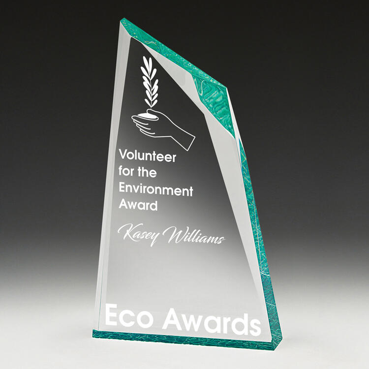 A contemporary recognition piece, this award pairs a bold asymmetrical silhouette with crisp clear and vibrant green acrylic. The rectangular form and engraved graphics offer a refined visual impact, making it ideal for commemorating achievement in a modern, memorable way. Crafted for distinction, it brings together quality materials and professional presentation.