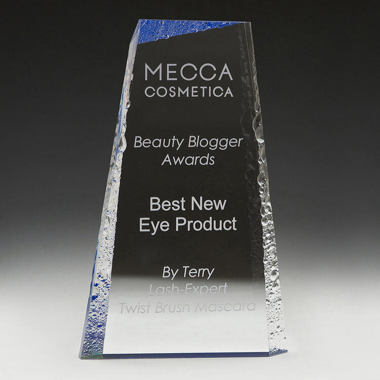 This acrylic award features a striking clear and blue palette, elegantly shaped into a tapered rectangular prism. Crafted from acrylic, it showcases a textured side design that adds a refined visual dimension. The engraved text and contemporary form make it a memorable choice for recognising achievement in any professional or celebratory setting.