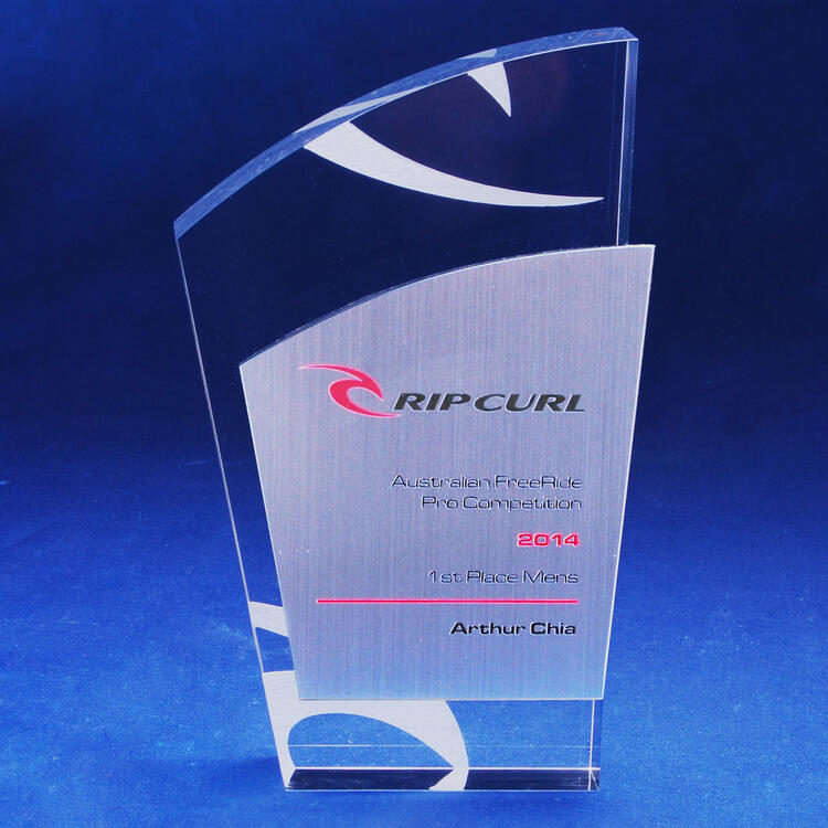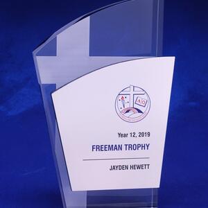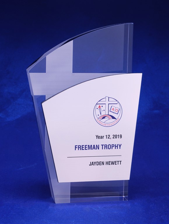 This contemporary acrylic award trophy showcases a striking Metalex facia paired with vibrant full colour digital print, resulting in a modern and professional presentation. The clear acrylic construction offers durability and visual clarity, while the metallic accent adds a refined finish. Ideal for commemorating achievement, this trophy is crafted for lasting recognition across corporate, educational, or community events.