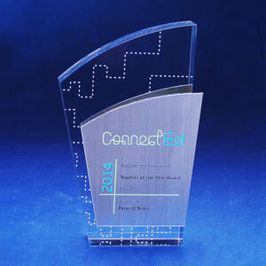 This contemporary acrylic trophy showcases a sleek acrylic body enhanced by a double Metalex facia, creating a sophisticated layered effect. The digital colour print finish delivers vibrant, precise detailing, making it an ideal corporate award trophy for outstanding achievement. Crafted for clarity and durability, its modern design offers a professional platform for recognition in any corporate setting.