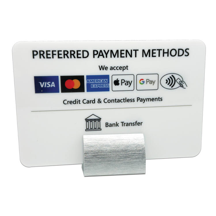 This sleek acrylic counter sign, featuring a sturdy metal base, is the perfect way to display important information right at your point of service. Featuring full-colour UV printing, it allows for crisp logos, QR codes, or personalised messages to be displayed with clarity and impact. Durable and professional, this sign is ideal for reception areas, retail counters, showrooms, or offices. The modern acrylic finish paired with the brushed metal stand ensures stability while presenting a stylish, premium look that enhances your brand presentation.