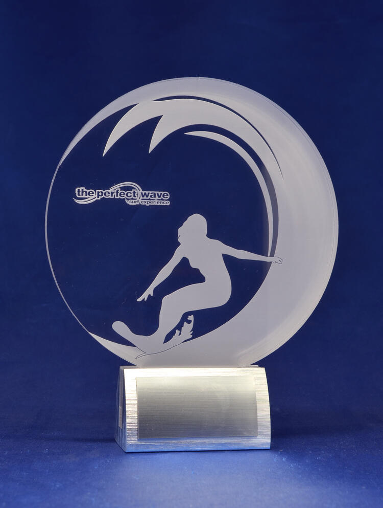 Blue Acrylic Wave with Mirror Silver Surfing Figure on Silver Metal Base